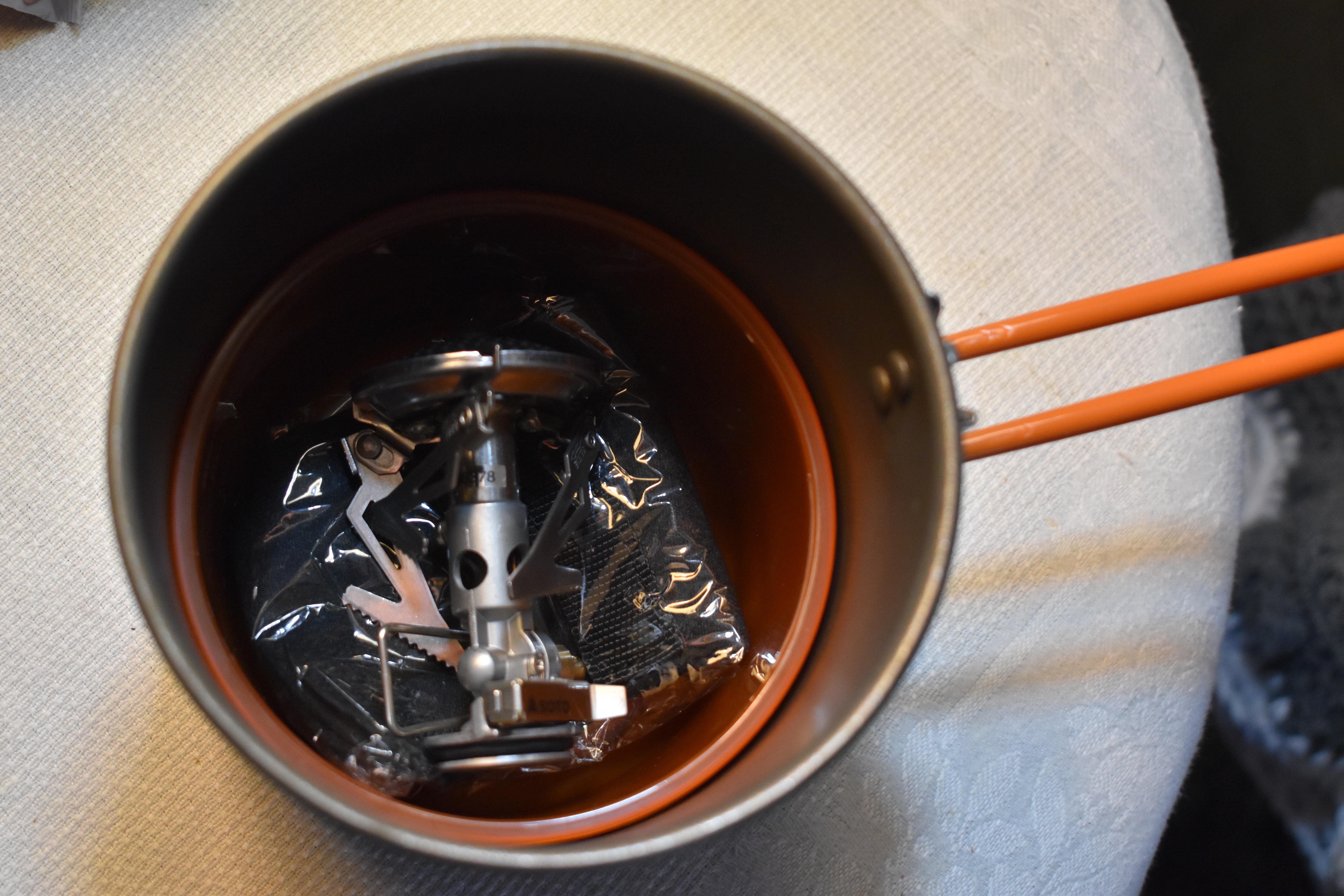 The set is specifically designed to fit the Soto Micro Regulator Stove inside. If you try a Pocket Rocket or some other canister stove, they won't fit. You can customize them by using a Dremel to cut the ends off the stove wings. They'll still hold the Soloist stove. You should also wrap a soft cloth around the pot before inserting the canister and bowl so the metal canister or plastic bowl don't damage the pot's teflon lining. This also prevents any rattling. We use a towel. Then we have it to help clean up. The 1.1 liter pot is actually big enough to prepare dinner for two. The spork is cute but rather useless. We leave it home and bring a regular knife, fork and spoon we've been using since our Boy Scout days. No, they don't fit in the pot but we just pack them with the food. If you use Mountain House or Alpine Air freee dried backpacking meals, this set works perfectly. If you're into cooking more complex meals from scratch, this might not be for you. However, if you and a partner each carried one of these plus a canister stove, your combined efforts could prepare just about any meal you wanted. The Soloist retails for about $45. |
