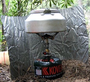 Like all canister stoves, you can only use a pot or skillet so big. The span of the stove arms is 3.7 inches. You can sit a pot or pan on the OD-1R as wide as 4.5 inches and remain stable. Most backpacking utensils, like the one in the photo at right, are this size. As seen in the photo below, on windy days, especially windy days when the chill factor drops below 32 degrees, a windscreen may help. As do most backpackers, we use tin foil. But only wrap it partway around on the side the wind comes from. Do not totally enclose the stove and its cartridge. The OD-1R puts out 11000 BTUs. This allows you to boil a pot of water water in 2-3 minutes. So a freeze dried entree, a soup or dessert, and a pot of coffee, tea or hot lemonade, could all be prepared in 10 minutes of burning time. This means you should be able to fix nine meals with one cartridge, assuming you fix breakfasts and lunches as elaborately as your dinners. Most backpackers don't, so their cartridge would last longer. |
