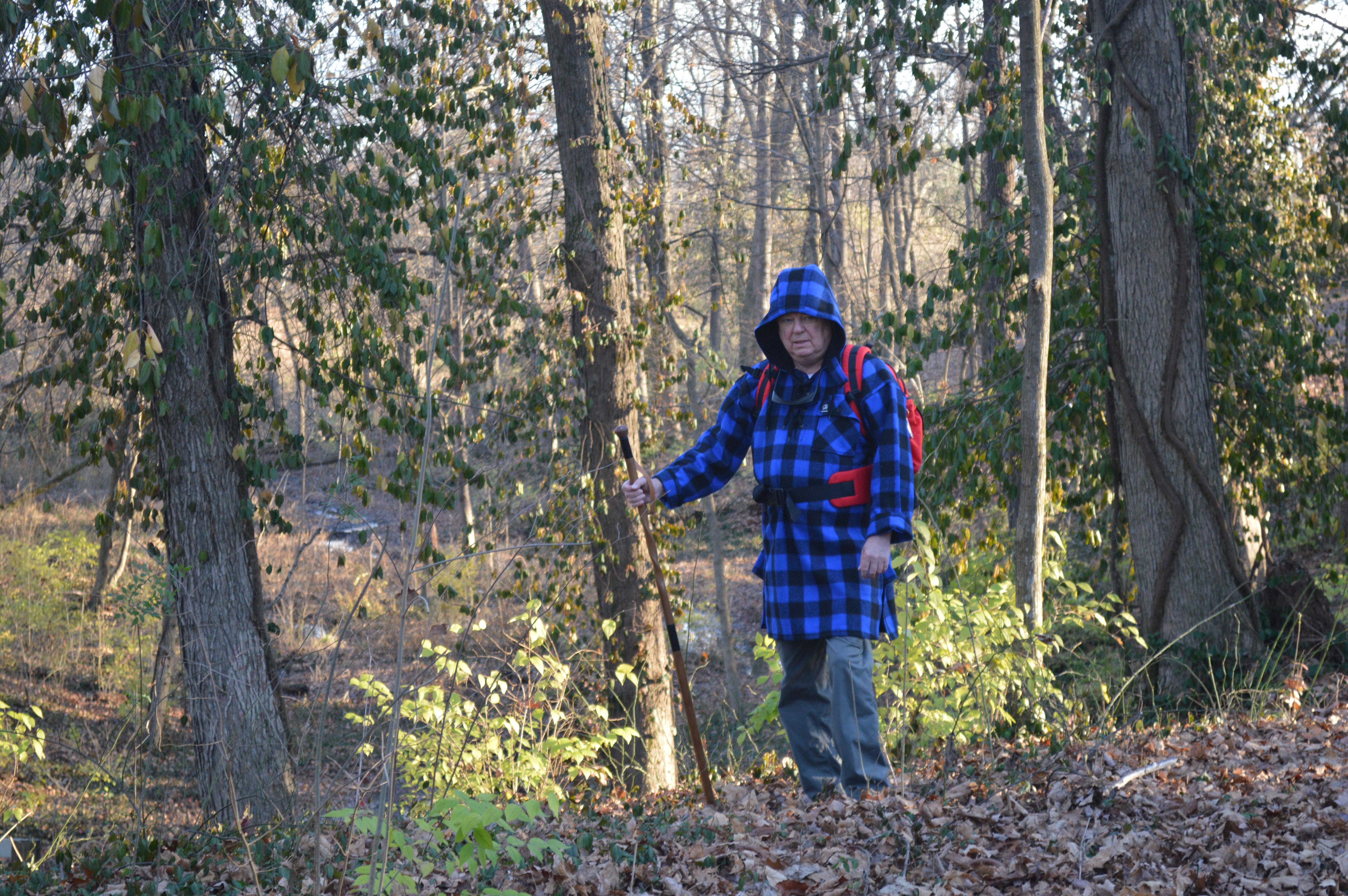 It's hiking or backpacking where the Bush Shirt really excels. The pack strap, as mentioned, becomes a sort of belt. The loose fit of the Bush Shirt does not interfere with your legs moving, not even if you're climbing steep hills. As you begin to exert more energy and warm up, you can unlace the front placket and/or throw back the hood to cool down a bit. Even though the Bush Shirt is water repellant, to avoid the extra weight of water droplets beaded up on its outside while hiking, we always carry a large rain poncho to pull on over it in case of rain. When you stop for lunch or a mid morning or mid afternoon snack, you can sit down and tuck your legs up under you and be completely protected by the Bush Shirt. |