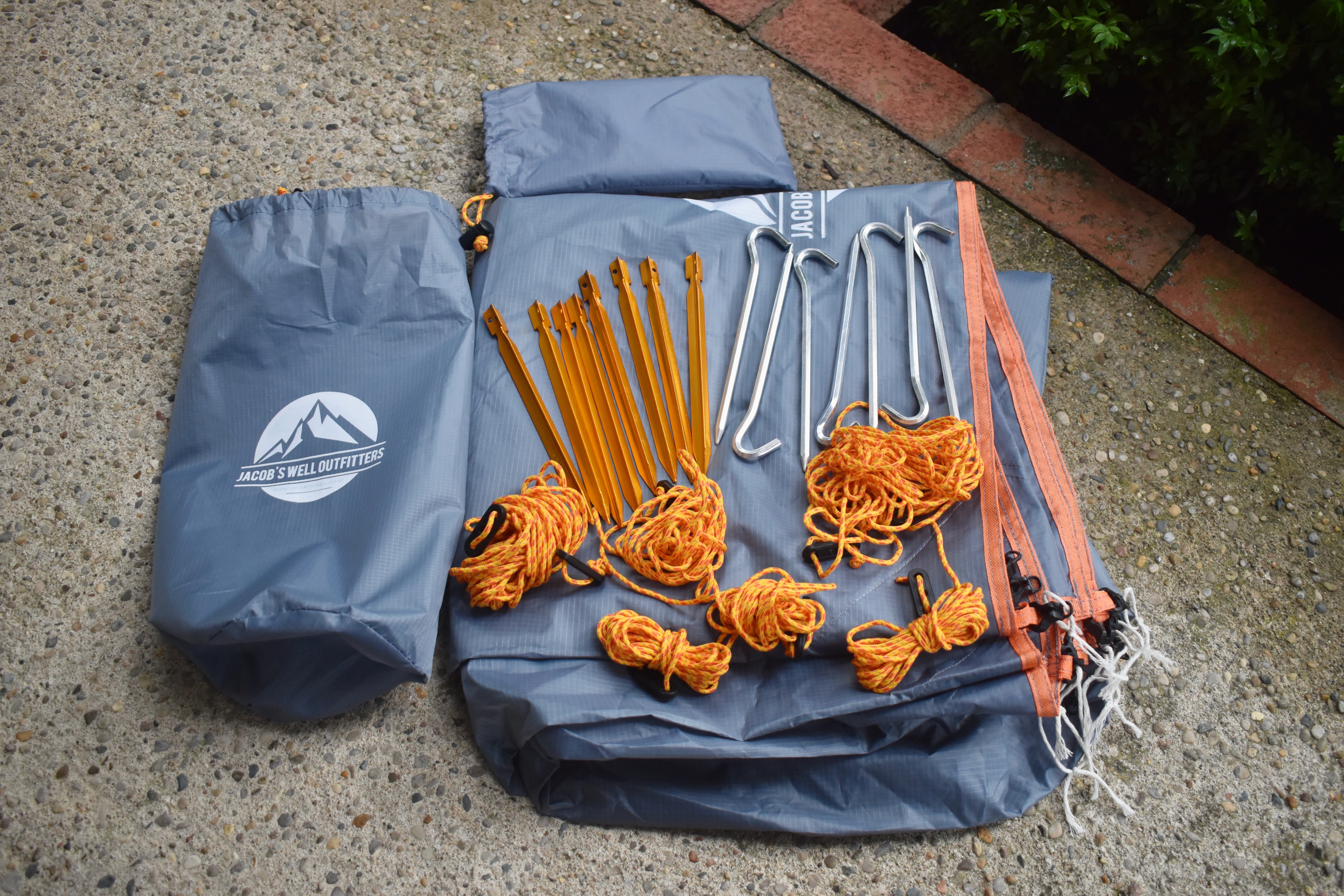 Also notice the double stitched edging at left. This extends all the way around the edge of the tarp. Finally, notice the classic ripstopping in the silnylon fabric. That's the grid of tiny squares you see across the entire surface. This is a pretty tough fabric, but if you did find a way to puncture it, this grid would prevent the hole from extending anywhere. So this is a particularly durable tarp. Many campers will figure out their favorite way of pitching it and only take those stakes and cords for that way. And some leave all the stakes at home and find branches where they camp, cutting stakes from them. We take the whole bag, because we never know what kind of campsite we may encounter, and this gives us maximum flexibility. The tarp, stakes and cords combined weigh two pounds, reasonable for the value they provide. You can order from jacobswelloutfitters.com. |
