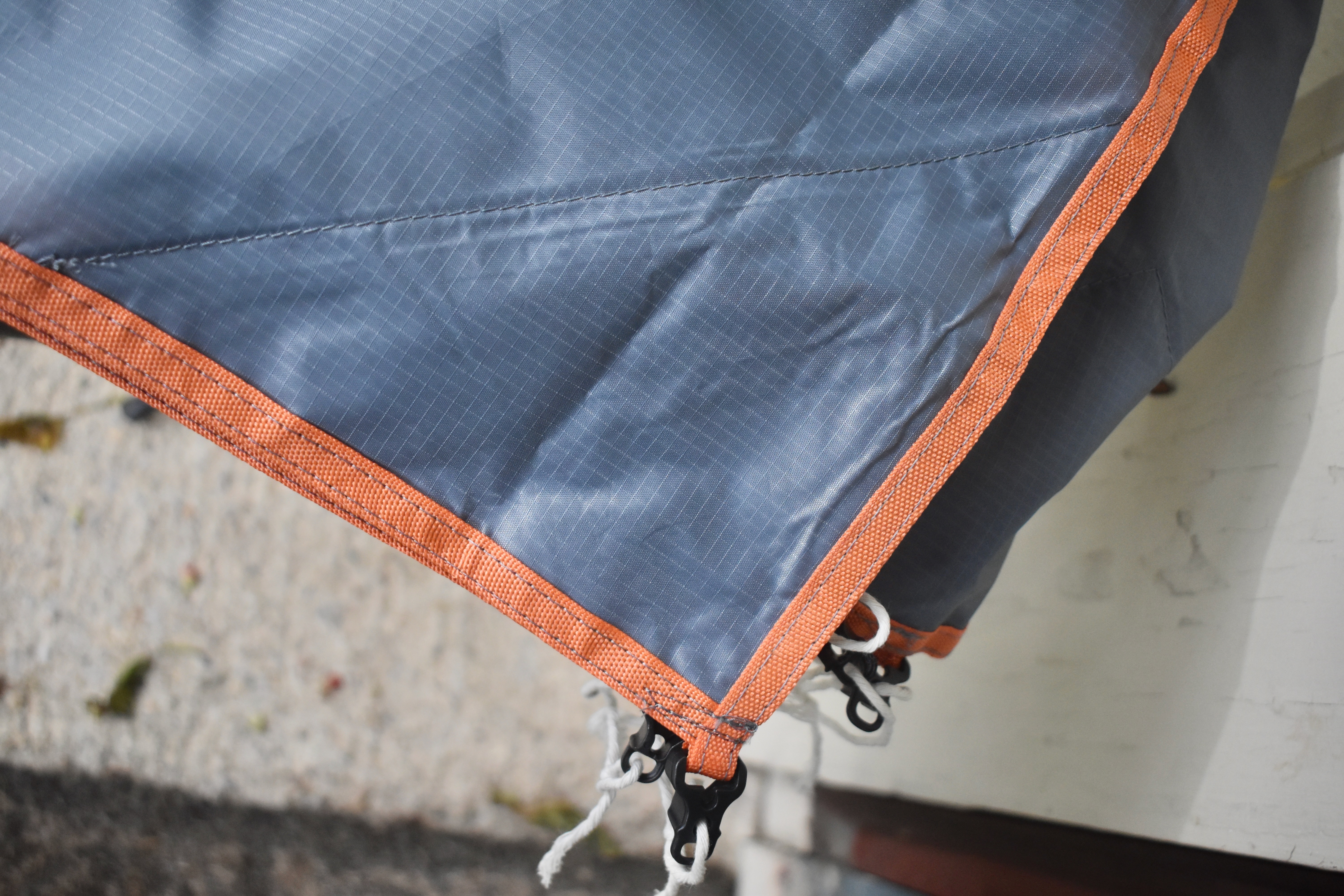 This mix of stakes and cords allows flexibility in how one pitches the tarp. You can hang it from trees or hiking sticks or stake corners down to the ground. At the top right we've pitched it over our trusty 1970s Gerry's Lodgepole tent. Above left we've removed the tent and hung a hammock underneath. Normally, you would raise the tarp and hang the hammock higher. We also know campers who use the tarp as a dining fly. They pitch it well away from their tents and cook and eat under it. As long as it's 6-8' high, a backpacking stove or reasonably sized cooking fire isn't going to threaten it. If you want a bonfire or larger fire for heat, you can build that under the open sky. The photo below shows how well the tarp is made. Notice the extra stitching coming across to strengthen the corner, which has to absorb tugging and pulling in high wind. This photo also shows the fasteners attached at each corner and down each side. We've added loops of string because we usually pitch the tarp as an A frame, using the larger stakes to fasten the corners down to the ground. |