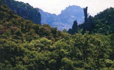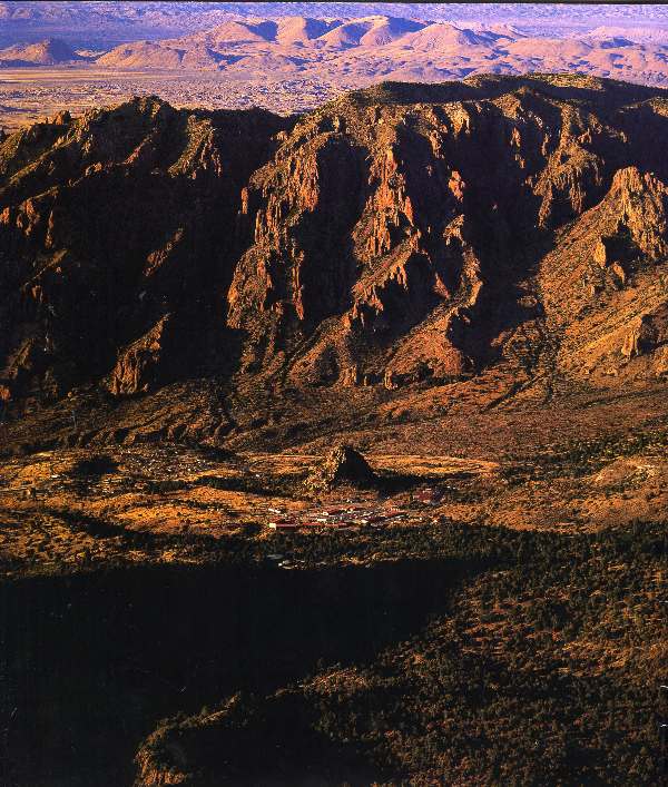 Ecologically, the park is a landscape of hot, dry desert floors with mountain plateaus of forests, meadows and mild temperatures. During the winter, backpackers utilize the trail network down on the floors, but in the summer months they do their hiking up in the mountains. That includes one of the nation's top 10 trails, the spectacular Chisos Mountain Loop. A five day, four night circle, the loop includes the South Rim, with views extending across into Mexico, Boot Canyon, pictured at left, and Emory Peak, the second tallest point in Texas. The Rio Grande canoeing trip we take carves through Santa Elena Canyon, with cliffs rising straight upward 1500 feet from the water's edge. The campground we use as our base of activities is pictured at top right, to the left of the cone shaped formation. We day hike to The Lost Mine and The Window from this location, then head up into the mountains in the background. |