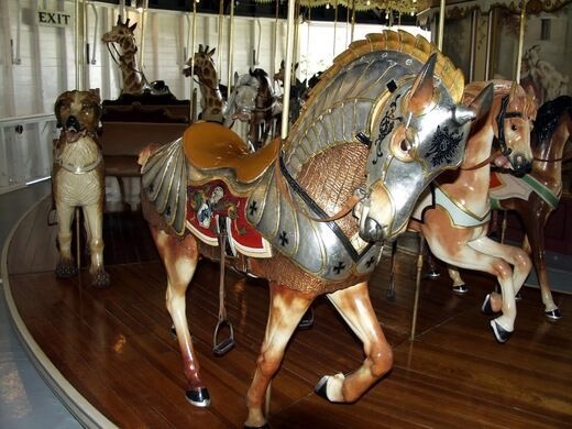 | The Best Western Carousel is a new motel, just off I-70, and very nice. There's a truck stop just across the street that serves very good food, but the famous restaurant in town is The Dish Room, a mile away. People drive here from Denver, Colorado Springs and Fort Collins just to eat at The Dish Room. It's pricier than the truck stop but has a creative menu. Before you leave town, you must drive two miles across town and stop at The Carousel. This is one of the greatest carousels in the world. Carousel enthusiasts from everywhere come here to see it, take photos and ride it. 100 years ago, the town bought it from Eylich Gardens Amusement Park in Denver. The love Burlington has lavished on this carousel is amazing. They built a building over it (below, left), with panels they lower and lock at night or in bad weather. Almost all the carousels remaining have been restored or rebuilt. This is one of the few remaining originals, officially Philadelphia Toboggan Company Carousel #6 (below, right). You can ride it for 25 cents. There's a Carousel Museum, too. | ![]() |