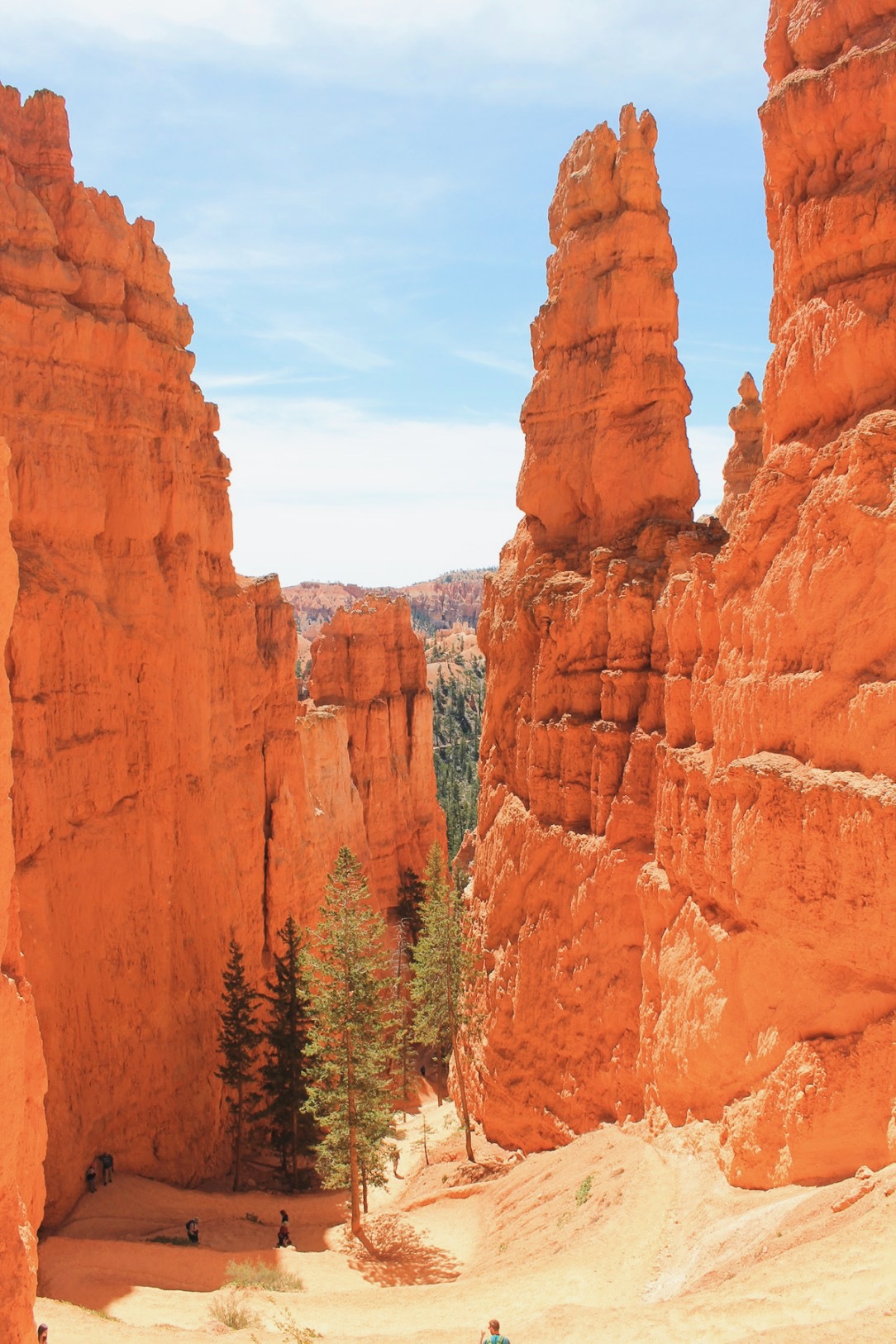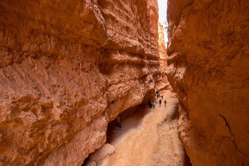 The Navajo Loop Trail is the big one. This is the trail that when you get back home, everyone is going to ask if you hiked. There are longer trails and more difficult trails but no trail is more spectacular than The Navajo Loop. It starts with an incredible set of switchbacks (photo, left) as you descend to the very roots of the canyon. You navigate a slot canyon (below) and circle through a series of huge formations (below left). The trailhead is at Sunset Point. The trail is only 1.4 miles total, as you drop 521 feet and then climb back up. But there are formations to see : Wall Street, Thor's Hammer, Juliet's Porch, etc. Allow about two hours, figuring on numerous stops for photos, water and to catch your breath. At the bottom, the Navajo Loop runs into the Queens Garden Trail and the Peekaboo Loop, so you can mix and match for a longer hike. |
