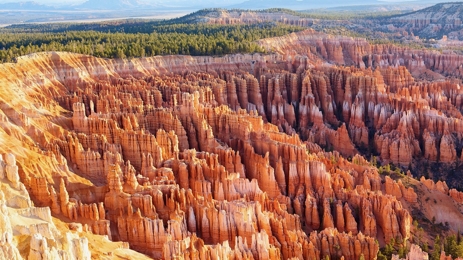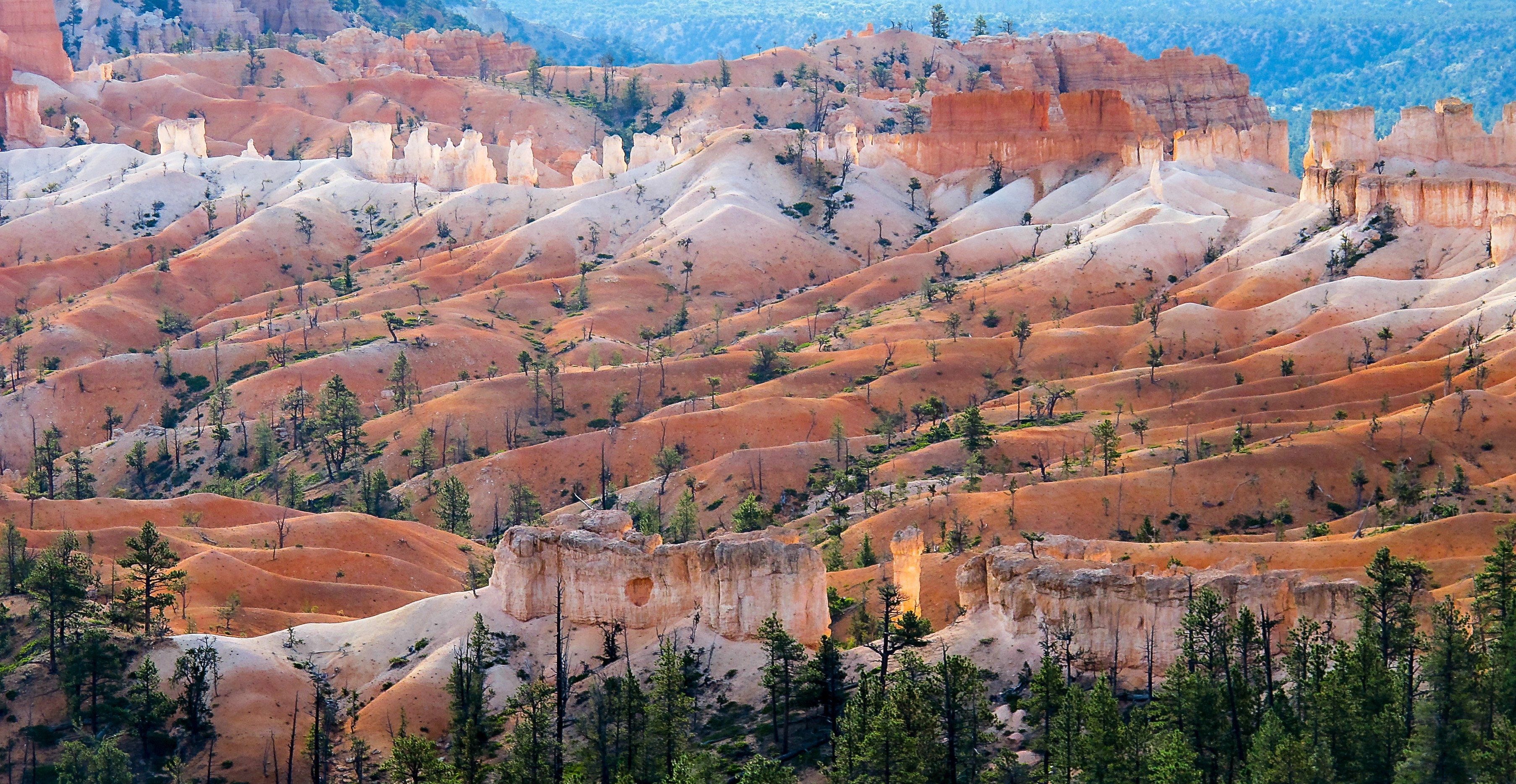 The Rim Trail is a great introduction to Bryce. It gives you an overlook of the Amphitheater from every different angle, allows you a day to adjust to the altitude and heat, and stretches your legs after several days of travel. Ideally you take the shuttle to the Bryce Point trailhead. You'll be stopping often to gaze in awe and take photos, so the hike will take most of a day even though the entire trail is only 5.9 miles and the main part that 90% hike is only 3.7 miles. The first segment, 1.5 miles to Inspiration Point, is the most natural. It's on dirt and winds through bristlecone pine forest with vistas opening out to your right. The next 2.2 miles, to the North Campground Shuttle Stop, is paved and includes frequent benches for admiring the scenery. At 2.7 miles from Bryce Point you come to the lodge, where you could stop for lunch. That would leave the segment to the North Campground for the afternoon. We highly recommend hiking the trail from Bryce Point northward. As you can see in the photo below, the trail steadily descends toward the lodge, Sunrise Point and Fairy Land Point. |
