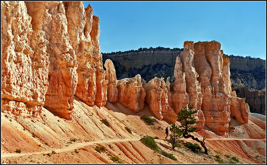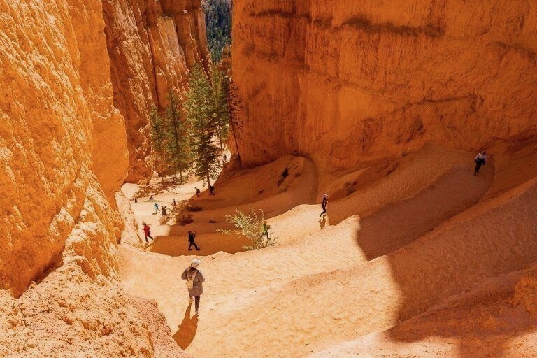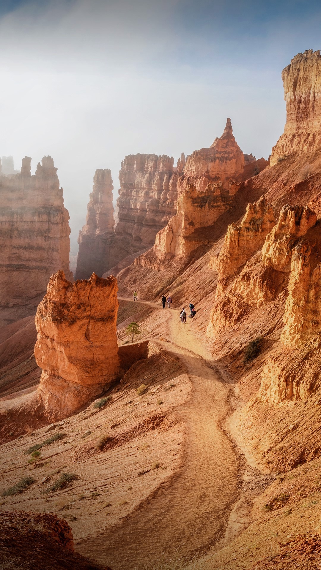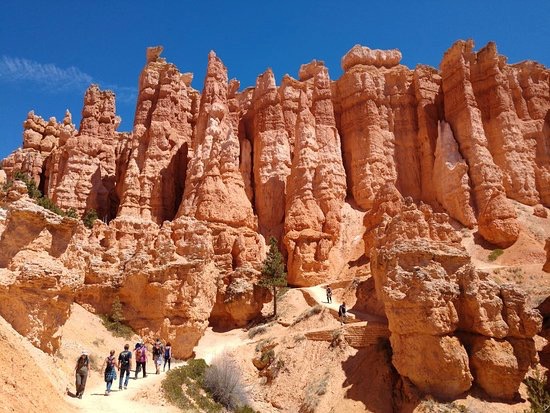 Bryce is a day hiker's park. It offers seven of the most unique day hikes in the world. Hikers come here from everywhere to check these trails off their bucket list. Two thirds of the day hikes begin and end within a short walk from the Lodge, making them the most accessible trail system of any national park. These are not particularly long trails. The scenery is very concentrated, meaning you see spectacular formations every several yards. However, the fact that these trails are so accessible actually makes them dangerous. Every day, people set off on these trails without the necessary preparations. You need sunblock. At this high altitude, the Sun beats down at full strength, and all these white, biege, red and orange rocks reflect it back up at you, so you are in effect being broiled. You need multiple water bottles, preferably filled with ice, then water. You need actual hiking shoes and not flip flops, Keds, or other flimsy footware. You need very good sunglasses and a broad brimmed hat. You need chapstick for the dry air. A major problem here is that almost all the trails (except for the few starting down at Tropic) begin at the top and drop steeply down into the amphitheater. They wander around the formations for a few miles of fairly level terrain, but eventually they head back up, and that last climb is long, steep and in full Sun. Every day, people who are not in good condition and are not good hikers head down these trails and cannot climb back up. Know Your Limits. You should do daily hiking back home to get yourself in good condition before coming here. Ideally, you should climb a long flight of stairs or a steep hill every day back home, or perhaps spend time on a stepper. You might give some thought to your camera. In this bright sun, intensified by thin air and light colored rocks, your automatic sensors may be overwhelmed. A good filter might be a wise investment. Even if you don't normally use them, this might be the time to invest in either a good hiking staff, or a pair of hiking poles. They might keep you from slipping on the sandy, pebbly descents or help you on the long, steep and slippery climbs back up. And be sure to carry a good trail map. You can get turned around and confused as you twist and turn in this maze of hoodoos. With a dozen trails crisscrossing, you need to be careful. Be aware that you will probably not get a cell phone signal down in the amphitheater. Only an InReach device can allow you to call back up to the rim. Don't get us wrong. Bryce is one of the great day hiking destinations in the world. But you have to take it seriously. They have park rangers here who specialize in search and rescue, and they go down after people every day. |