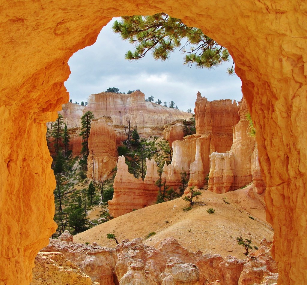 The Peekaboo Loop Trail is so named because of the tunnels, arches and windows you see along it. Some of them you hike through or look through, and others are above you or off to the side. This may be the most photo- genic of the Bryce Trails. It's 5.5 miles long, a complete loop with a short spur to bring you down and take you up to the rim. The trailhead is at Bryce Point. You hike down a tenth of a mile and turn left on the Under The Rim Trail, a 3-4 day backpacking trail coming from Yovimpa Point at the south end of the park. You turn left, hike 0.9 mile, then turn right onto Peekaboo. You'll see the Wall of Windows, the Three Wisemen, the Organ, the Cathedral and the Silent City directly in front of you, and look out toward the Aquarius Plateau, Mt. Canaan, Boat Mesa and the Kaiparowitz Plateau. At one point you pass through a small cave. This is a combination hiker and horseback riding trail. As such, you must be careful of horse droppings. This annoys many hikers, so they avoid it. Don't. This is a beautiful trail, well worth the inconvenience of watching your step. Since three hour horseback rides stop here for their break, Peekaboo is the only trail in Bryce with portajohns. Allow 3-4 hours. You'll drop 600 feet, then gain it back. Experienced hikers combine this with the Navajo Loop Trail to form the famous "Figure 8 Hike," exiting at Sunset Point and walking back along the Rim Trail to Bryce Point and their car, or catching the Shuttle at Sunset Point. This makes a 6.0 mile, 4-5 hour hike. |