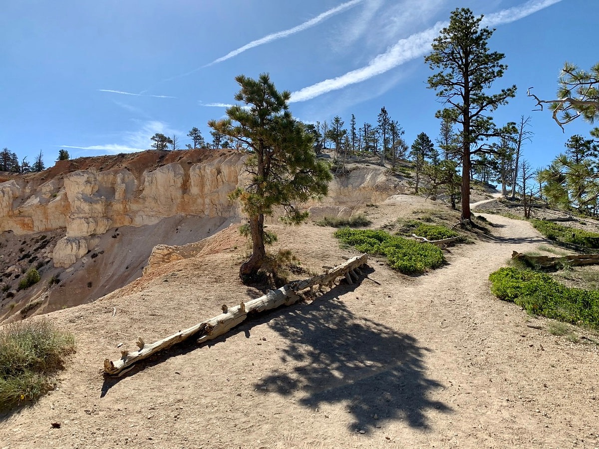 Bryce Point is at 8300 feet. That's significantly higher than Denver, Dubois, Flagstaff or Jackson. Given this altitude and the 100+ heat, hiking that steady downhill is a lot easier than hiking steadily uphill would be. As you can see by the photo, sometimes the forest thins out, mostly due to past fires, but other times it closes back in. The final part, from North Campground - Fairyland Point, is again natural, on dirt, through forest. It's extremely scenic, with views of Boat Mesa and Fairyland Canyon you can't see otherwise. However, unless you spot a vehicle at Fairyland Point, you have to hike 1.5 miles out to the Visitor Center to catch the Shuttle. This is a level walk through open pine woods. The beauty of the hike along the rim makes it well worth it. On that last 1.5 miles you're also very likely to see wildlife, as Deer, Antelope, Elk, Porcupine and Prairie Dogs frequent the area. The Rim Trail is a very civilized, almost decadent, hike. There are benches placed periodically. The Shuttle stops at six points so if you get hot or tired you can opt out and ride back to the lodge or to Ruby's. |