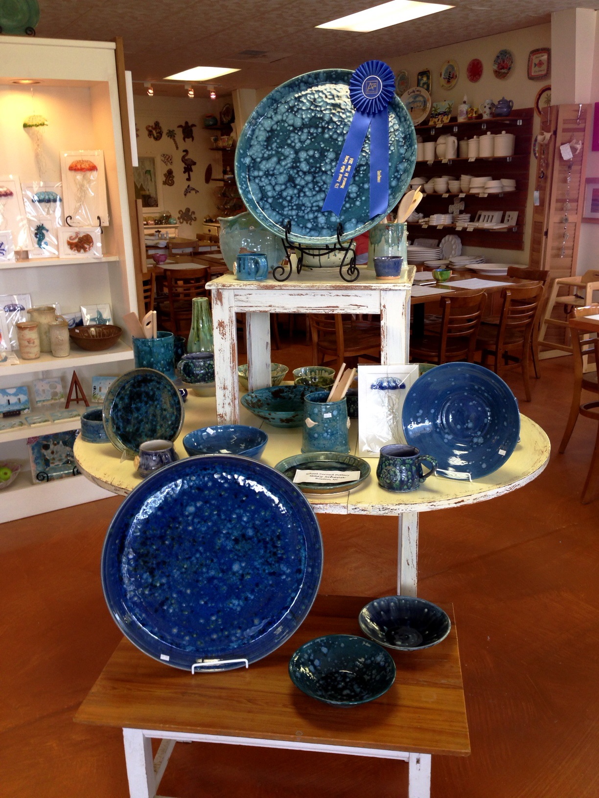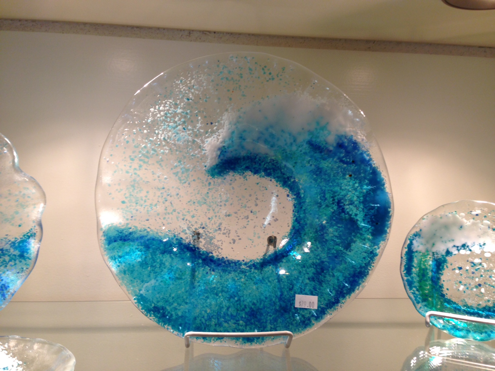 | Carolyn and Gary Schena majored in Glass and Ceramics respectively in college in New York, then moved to Hatteras to open Studio 12, a combo studio / gallery where they display and sell their art, offer lessons in glass, ceramics and jewelry making, and offer the public the chance to create their own ceramic works. They create their own art from October through April and sell it from May through September. Most of the work shown is theirs, and it's impressive. Carolyn works mostly in glass, creating very delicate, strikingly beautiful coral bowls (below left) and wave bowls (below right). Gary specializes in large, thin and lightweight ceramic platters, dishes and other servingware (below center). His work has won first place in Carolina competitions. Studio 12 faces Highway 12 in the center of Avon. | ![]() |