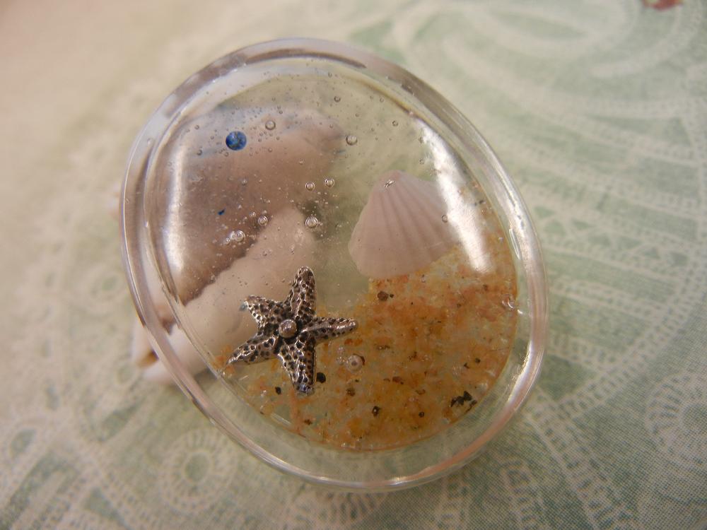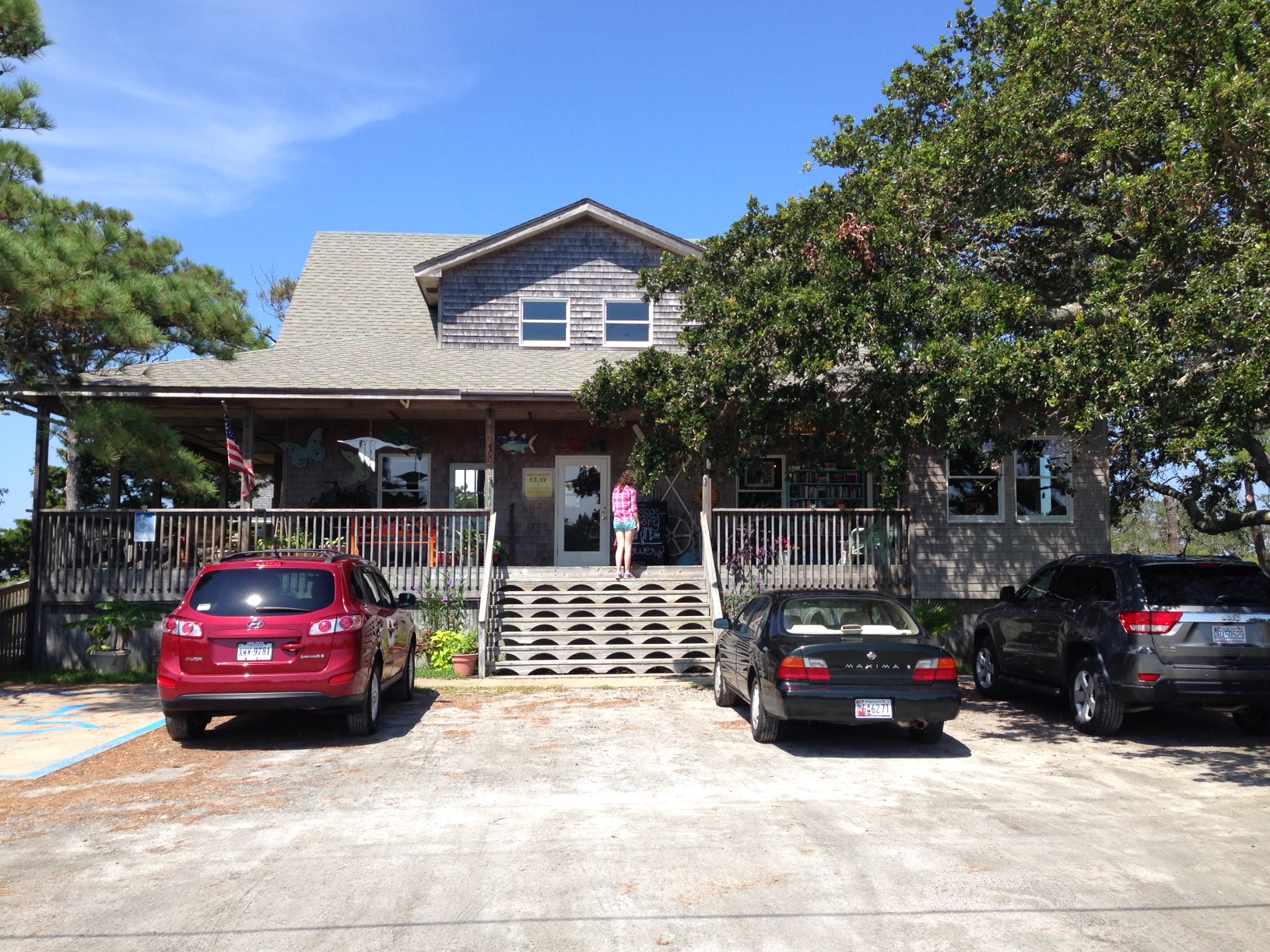 The Blue Pelican Gallery is near the intersection in downtown Hatteras Village. Owned by local artist Jenn Johnson, it features pottery, jewelry, glassware and fiber art. This is the best place on the Outer Banks to find Dune Jewelry (below left), Beachsand Snowflakes (center), and Beach Globules (the one pictured contains sand, two shells and a sterling silver starfish), all made with Hatteras sand. But it's also a center for Yarn. They sell various national yarn brands and the tools to knit and crochet and there's usually someone around to discuss yarn arts with. This is a converted residence but it's crammed full of art and is worth at least an hour visit. After three hurricanes in one year in 2020, they raised this house up on stilts so it looks slightly different today. |