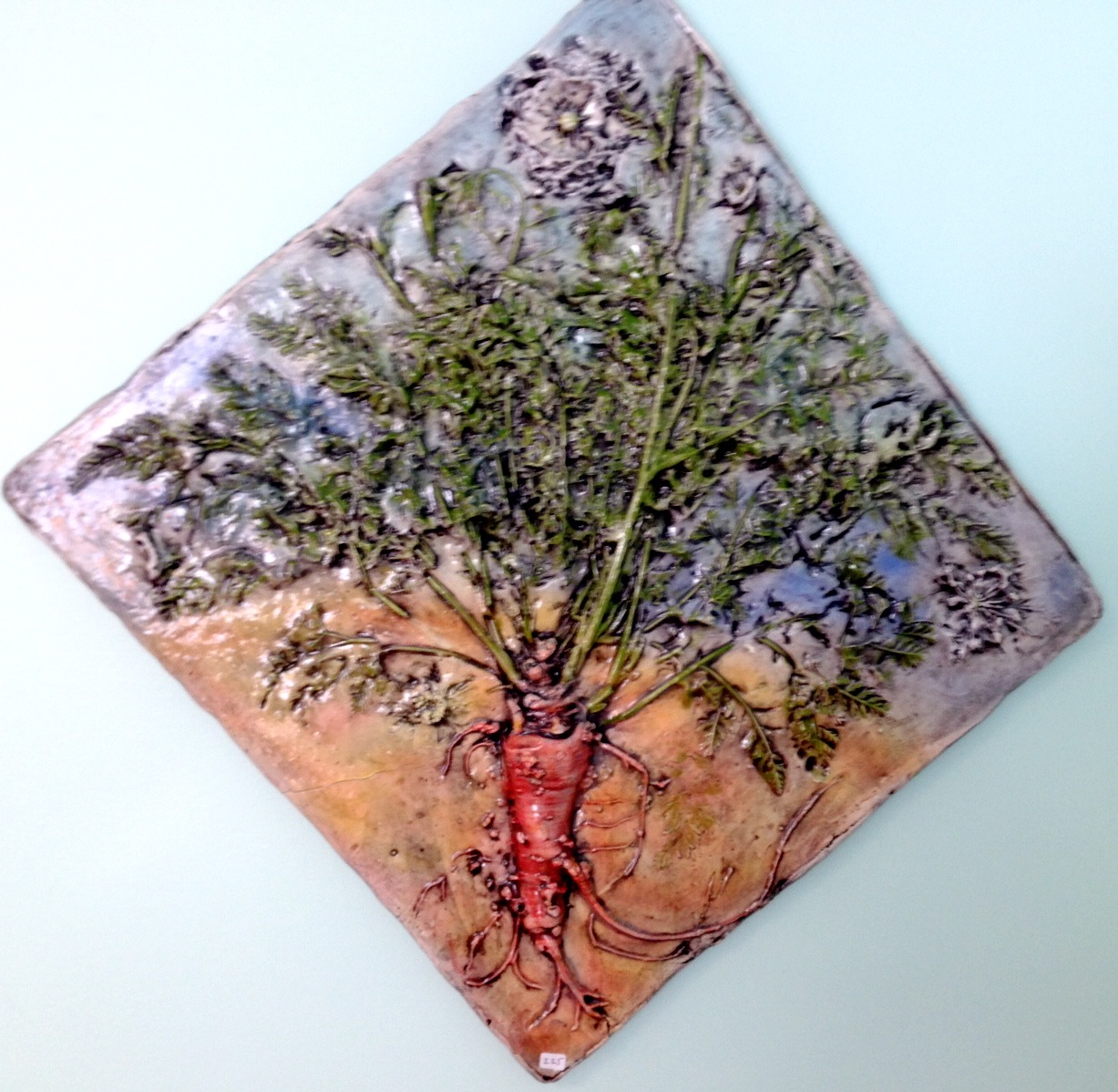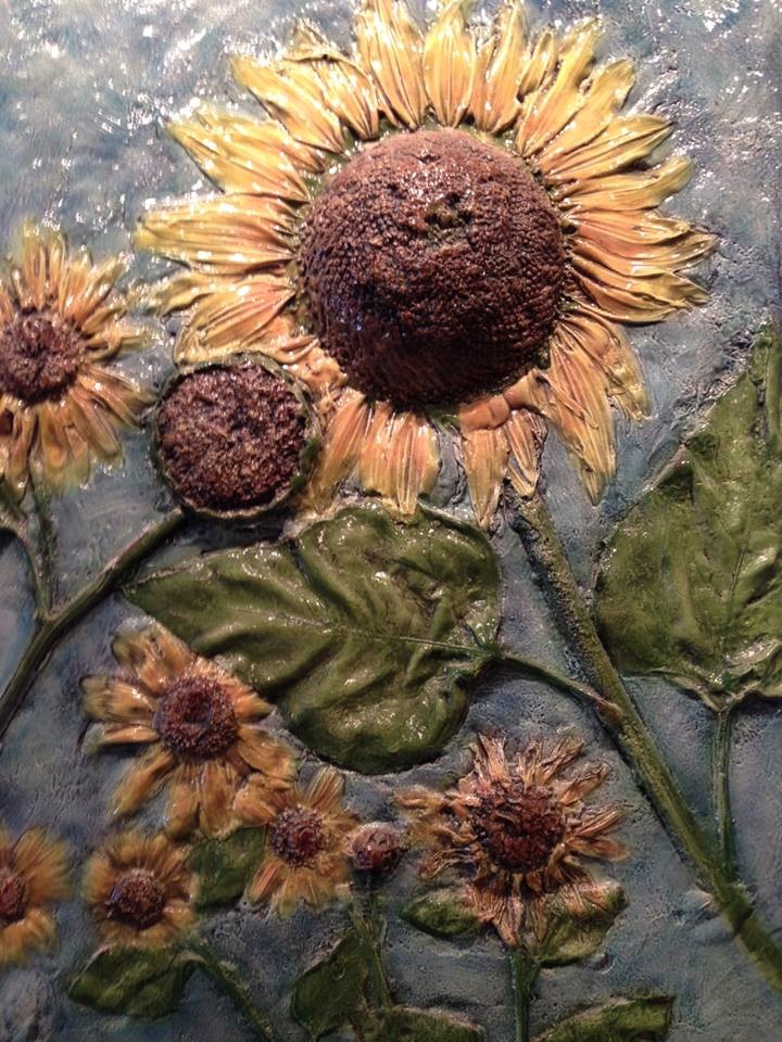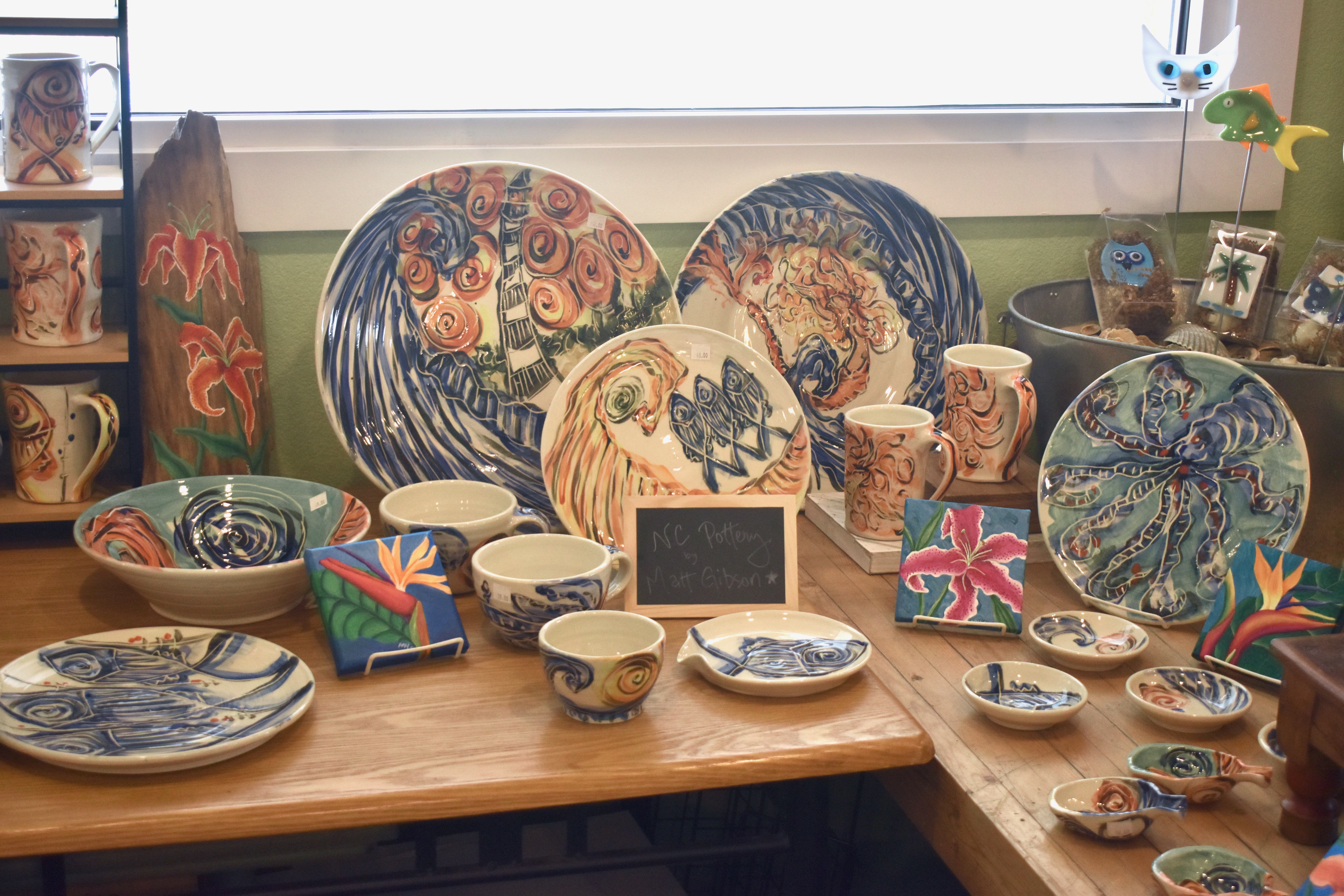 Back in the fishing village of Kinnakeet, Antoinette Mattingly runs the Kinnakeet Clay Studio & Gallery. She works mostly in Ceramics but also displays works by other artists. The strength of her collection is the array of raised basrelief panels and other items, which require three steps to make. First the artist has to make a mold with the details carved down in. Then she lays the clay over it so the depressions in the mold create raised features in the panel. She fires that at low heat, glazes and paints it, then refires it at high heat. The results are striking, as in the sunflower panel on the left, which hangs on the wall like a painting. The free standing sunflower in the center photo has a full stem and can be mounted on a wall or placed in a large vase. Dianne Lee creates the crab adorned pottery at right, which are intended as a dramatic centerpiece. Kinnakeet Clay also offers classes in ceramics, watercolors and other art forms. |