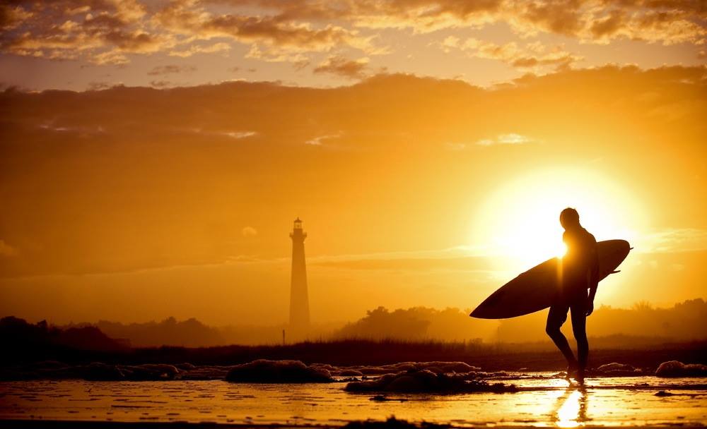 | Daniel Pullen grew up on the island and is now one of its most gifted photographers. He and his wife run a studio out of his home. Pullen's iconic Sunset Surfer photo (right) has won numerous awards and is available framed for $250, or in various smaller sizes unframed for as low as $25. But he has hundreds of other images in the same price range. Pullen also works as a wedding and official school photographer, so he is not always in his gallery. His works, especially the famous surfer shot, are available at art galleries throughout the island. | ![]() |