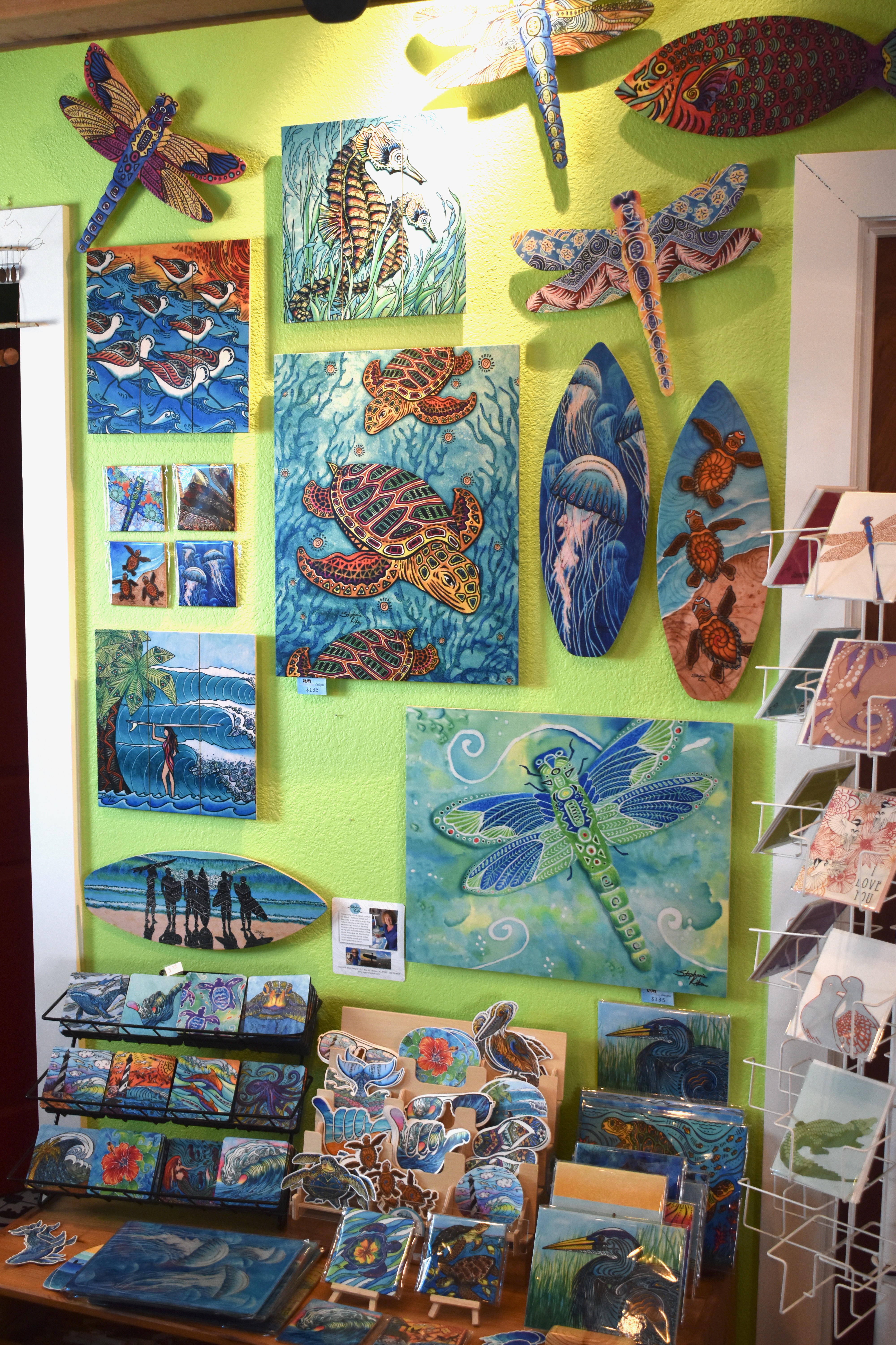 | What used to be Indiantown Gallery is now Swell Art. Its new home, in the front building of the Swell Motel in Buxton, is unimpressive on the outside, but don't let this deter you. Inside is a fine collection of local art created either on the island or within the state of North Carolina. April Trueblood was the manager of Indiantown and is still the manager here, but she says the collection has taken a major change in direction. It no longer features as much spectacular local photography, but still has one corner of mostly Don Bower shots. Bower lives in Frisco and is staff photographer for the Island Times. Several of Indiantown's favorite photographers have retired or stepped away from their cameras. The Swell does offer beautiful tiles (below left), by Stephanie Kiker, an NC State art graduate who lives on Hatteras and surfs and kiteboards between studio sessions. There are also ceramics (below center) and paintings (below right). The Swell offers whimsical pieces, jewelry and metalwork. Their collection represents a dilemma local and regional artists face. Buyers prefer handmade pieces, but artists have a hard time keeping up with demand. They can only create so many pieces a week. To produce more, they outsource their work to companies specializing in reproductions. This produces more art and increases their income, but can no longer be called handmade. Most of the work displayed here is still handmade but there are some pieces reproduced. | ![]() |