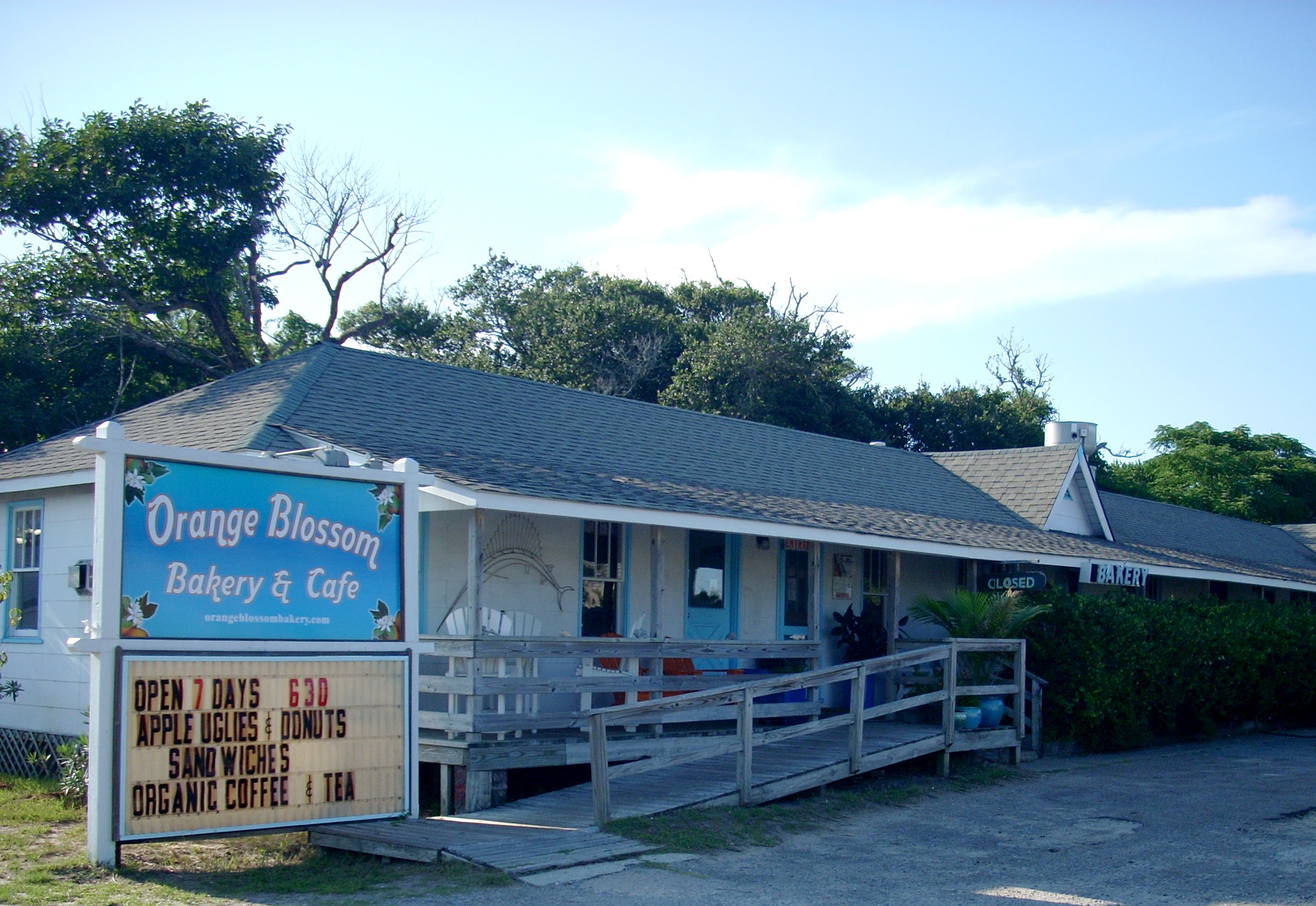 | The Orange Blossom Cafe started as a bakery and in 1992 opened the breakfast and lunch gourmet bistro. They originally planned to base their reputation on their coffees. They make it European style, using either an espresso machine or a French press. They do not believe in filtering of any kind, thinking that it filters out the oils which produce the flavors. The result is the finest coffee on the island, and the crowds each morning suggest lots of people have become addicted to it. The Orange Blossom became sort of an island version of Starbucks. But the coffee was upstaged by a kitchen accident. A travelling baker showed the owners how to take leftover donut dough, mix in apple slices, and produce a fritter. When they tried it on their own, it came out looking like the ugliest thing they had ever seen, nothing at all like a classic fritter. The Apple Ugly was born. They experimented and found out they could bake it as well as fry it. Over several decades, the Apple Ugly has become as much a symbol of Hatteras as fishing poles, surfboards and the lighthouse. Thousands of annual visitors consider a visit to the Orange Blossom as essential as the daily trek to the beach. Just remember there are lots of other items available, at the bakery and in the cafe. | ![]() |