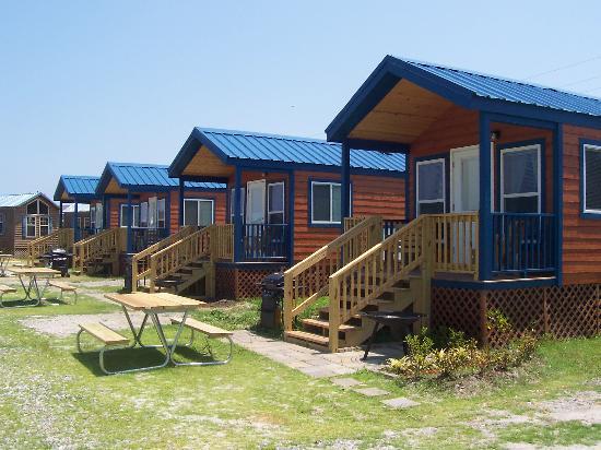 | Obviously, camping is the most economical way to spend a week or two on Hatteras Island. However, if you're coming in June, July or August, you need to consider this option carefully. Hatteras days often hit the high 90s and even 100. Insects, especially biting flies and mosquitoes, swarm in clouds every evening. And a sudden storm hits about once a week, with high wind and intense rain. Camping here is idyllic in Spring and Fall, but in Summer you need good netting, bug spray and a tolerance for heat and humidity. Despite these concerns, thousands of people camp here every Summer and many of them have been coming back to the same campground for decades. You'll need to reserve a campsite well ahead. Remember that modern "camping" also includes the "camping cabin" option. KOA and the Frisco Campground both offer these cabins. They have no kitchen or bathrooms, but they are a step up from tents, offering huge advantages vs. storms, bugs and heat. These cabins are at the Rodanthe KOA. The Frisco cabins are pictured further down the page. | ![]() |