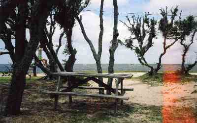 | If you want to camp, you still have to decide between sound and ocean. If you want the sound, we recommend Frisco Woods Campground. A typical site is shown at right. You have shade, a picnic table, electricity, and a great view of the water. These sites are far back from Route 12, so you hear no traffic noise. This is a popular campground with windsurfers, because the water in this picture is the famous Canadian Hole, the greatest windsurfing location in the world. It's also a mecca for kayakers, with Pamlico Sound being the best paddling water in North America. Camped here, you are protected from storms coming in off the ocean, and high dunes across Route 12 protect you from overwash. You are obviously vulnerable to storms moving from the mainland across the Sound, and surges have hit here directly. However, you will not be taken by surprise. If a storm of that magnitude is building, you'll have plenty of advance notice. Hot showers are nice. This is a great place for kite flying because the consistent breezes usually blow from the trees out toward the water. | ![]() |