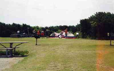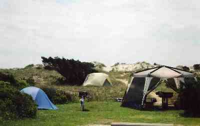If you want to camp on the ocean, we recommend the National Park Service's Frisco Campground. It's hidden back in the dunes away from Route 12, and most people drive by without noticing the entrance. It's the quietest and most secluded of all Outer Banks campgrounds. Trees and bushes provide privacy but not much shade. The campground is protected from the ocean by a high wall of dunes. There are 127 sites, but they have no hookups. Each site has a grille and picnic table. There are restrooms and drinking water, but the showers, while nice, are not heated. Pets are allowed if kept leashed. The beach here is beautiful and empty, since it is only accessible to campers. A breeze blows across the dunes from dusk to dawn. If you camp here, bring net shelters to cook in and relax outside your tent in, and make sure your tent has good netting with no tears. Otherwise, at sundown and sunrise, you'll be eaten alive. First come basis only; no reservations. Photo at right shows the group site. All other sites are smaller, hillier, and more private. 252-473-2111 |