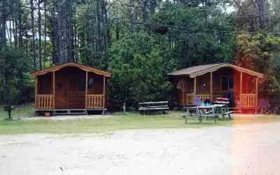 If you want a primitive experience but feel too exposed in a tent, Frisco Woods offers these one and two room cabins. They have screens, electricity and air conditioning. They're set further back from the water than the tent sites, in a grove of trees, on somewhat higher ground. Another row of cabins is available up by Route 12 but we suggest you reserve far enough in advance to avoid those, with their highway noise. There's a dishwashing area, coin laundry, fish cleaning bench, solar heated swimming pool, grilles and picnic tables. The camp store is fairly large, with gas, camping supplies, food and the usual touristy gifts. If you rent windsurfing rigs, surfboards, kayaks, or other equipment, all the major outlets will deliver and pick up at Frisco Woods. 800-948-3942. www.outerbanks.com/friscowoods. |