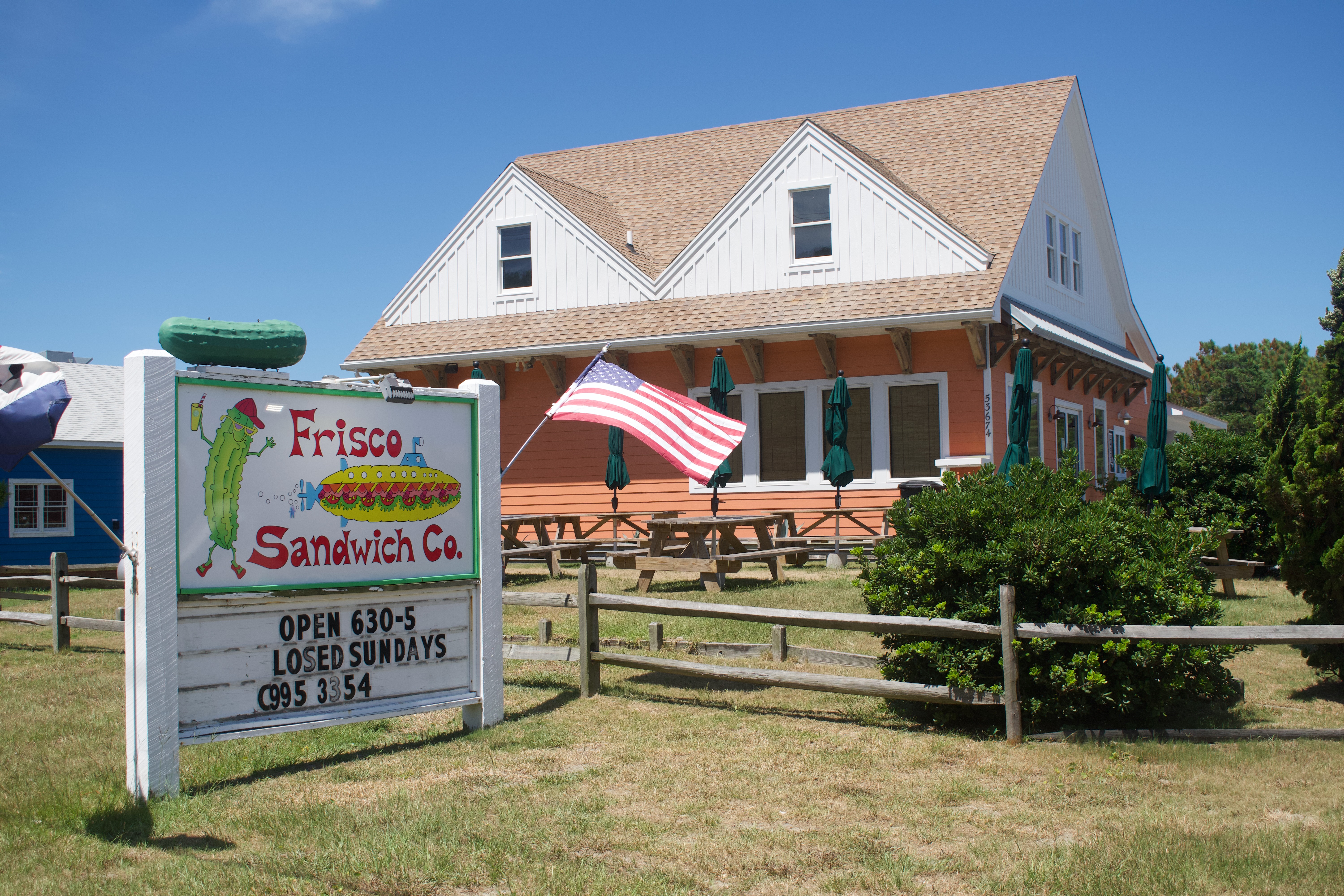 Frisco Sandwich Company serves not only Sandwiches but also Wraps, Subs, Paninis and several specialties. You can get a good House, Shore, Pasta or Caesar Salad here. We like the Shore, with its chopped romaine, ham, turkey, cheddar and veggies. Their Fried Pickles, Potato Salad, and Cider Vinegar Cole Slaw are fine sides. Specialties include a Crabby Patty (housemade crab cake), Pulled Pork BBQ, Cowabunga (grilled half pound beef patty), Chicken Salad Sandwich and Black Bean Burger (with pimento cheese, sprouts, sliced avocado and herb mayo). They offer six Wraps. The Club contains ham, turkey, bacon, cheddar, provolone, romaine, and tomatoes. The Muff has ham, capicola, salami, roast red pepper, black olives, romaine, and red wine vinaigrette. The Mellow Mushroom offers mushrooms, tomatoes, feta, almonds, romaine, and a balsamic vinaigrette. There's also Aloha, Tree Hugger, and Chicken. They serve five Subs, six Paninis, and six Breakfast Sandwiches. The Italian Sub or Panini contains capicola, ham, salami, provolone, banana peppers, tomatoes, romaine, mayonaise and Italian dressing. |