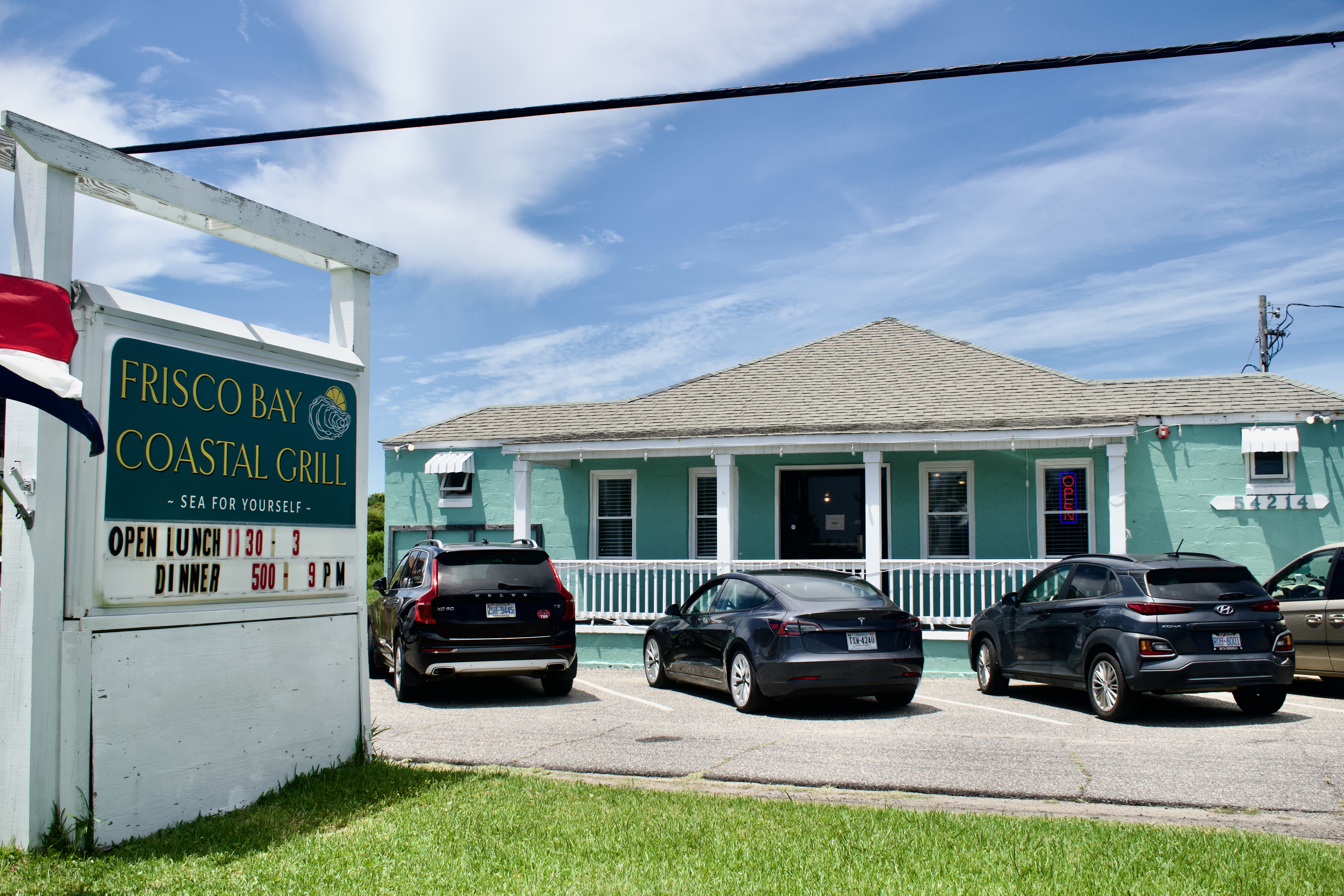 | The Coastal Grill serves a very upbeat, cutting edge menu. Even its Appetizers set the tone : the Nacho Pancho is roast shredded pork, black beans, pico de gallo, lettuce, cheese, sour cream and pickled jalapenos over homemade tortilla chips. There are Wings, Grouper Bites, Calamari, Shrimp Seviche, Cabbage Rolls, and Tuna Avocado. They offer a very good Clam Chowder or a Seafood Soup, and three Salads. There are four Sandwiches and three Tacos. For Entrees, you choose from Chicken, Vegetable Curry, Seafood Pasta, Wild Mushroom Stuffed Ravioli, Ribs, Tuna Steak, Shrimp & Grits and Kentucky Bourbon Maple Glazed Salmon. Their Signature Dishes are Shrimp, Scallops, Snapper and a Seafood Platter. This is the newest restaurant on the island but it's already a favorite among Frisco and Hatteras Village residents and renters. | ![]() |