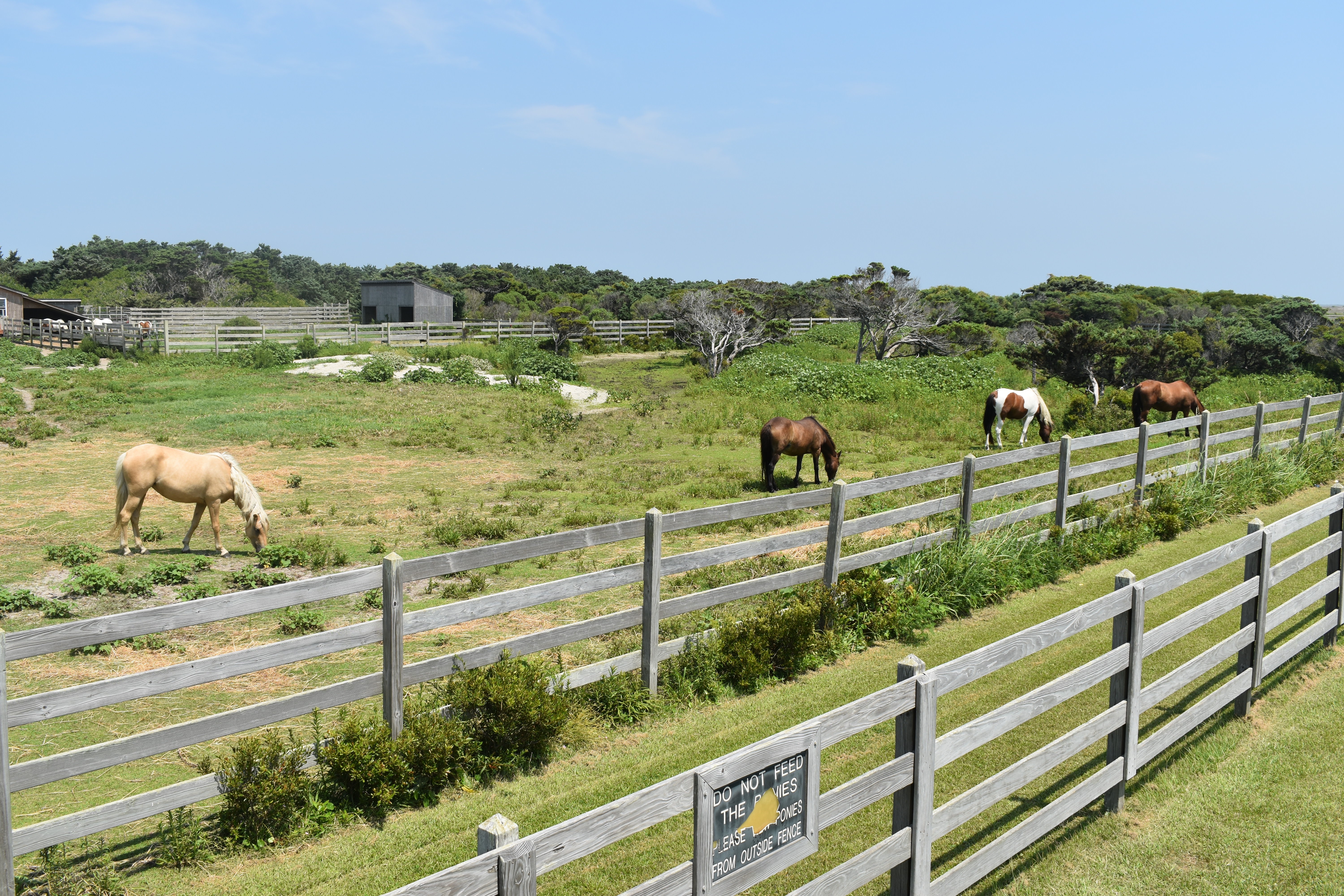 You'll also pass the front pasture of the famous Ocracoke Wild Ponies. Descendants of ponies who swam ashore from shipwrecked Spanish ships, these have grazed wild on the island ever since. Every week, the National Park Service rotates several of the ponies to the pasture along the road so visitors can see them. The full herd grazes along the shore of Pamlico sound from here to the village. They thrive on the salt grass. The herd was never large, and today numbers around 25. Genetically, these are almost a separate species : Ocracoke ponies have two fewer ribs and four fewer vertebrate than other horses. Back in the middle of the 20th Century, the Ocracoke Boy Scout Troop maintained the ponies, rounding them up a few times a year and checking for health problems. Sometimes the boys would tame and ride them. The Park Service ended that practice. Similar herds exist at Corolla and Assateague Island. To maintain genetic diversity and minimize inbreeding, the Park Service exchanges ponies among the islands. Visitors are forbidden from feeding or harassing the ponies. |