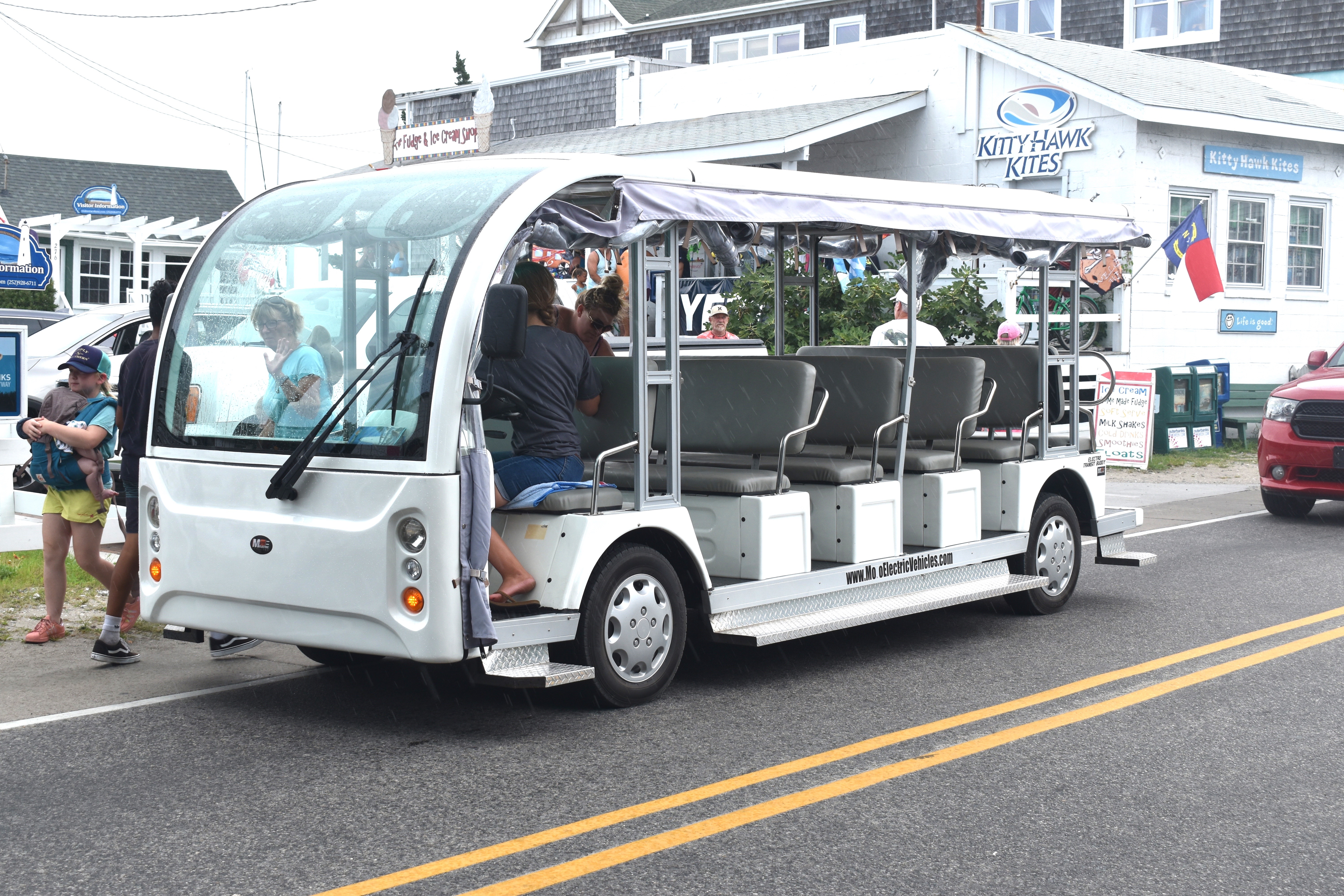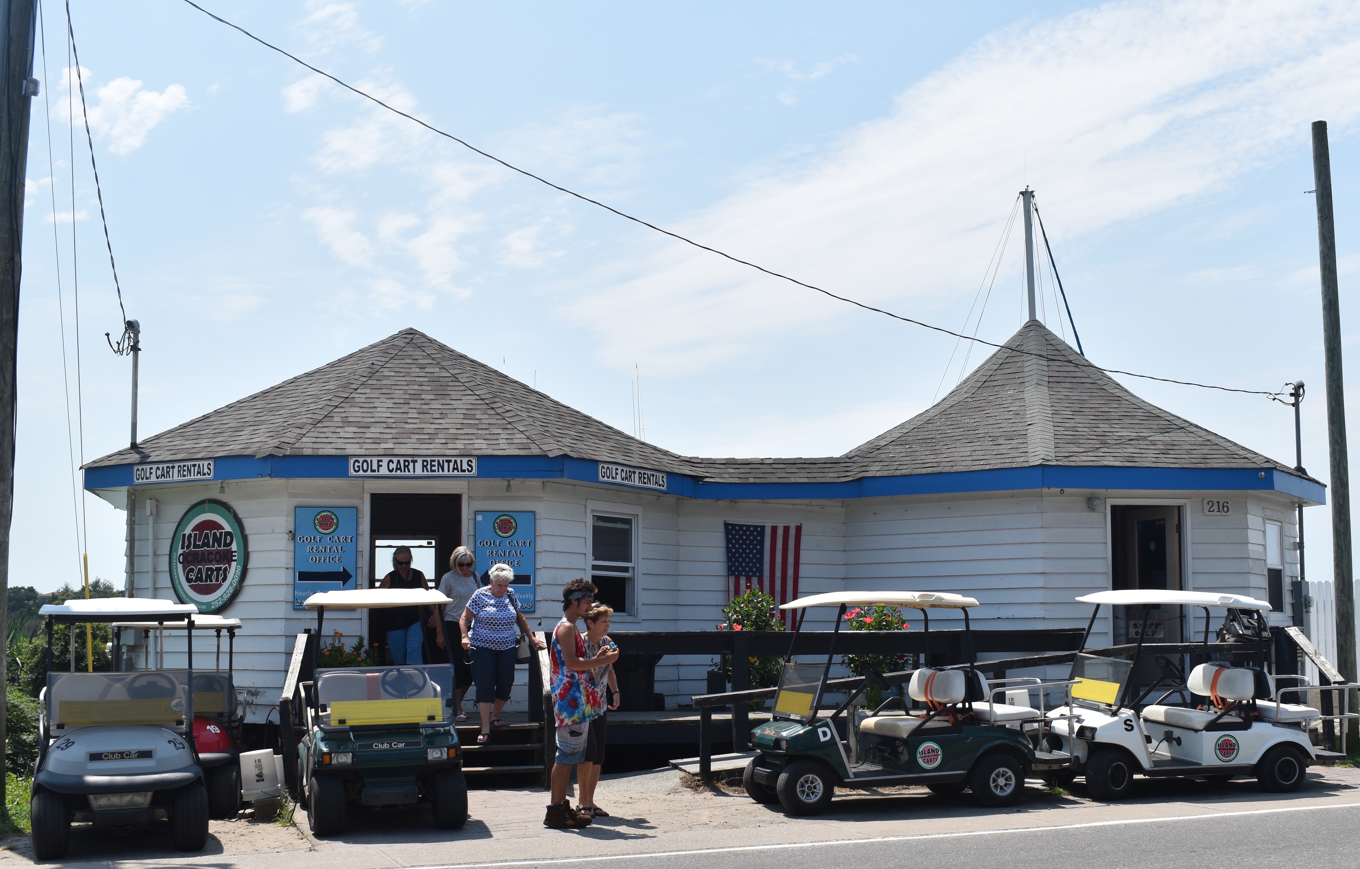 | A shuttle rotates through the village continuously with frequent stops. You can get on and off as you wish. The loop begins at the ferry dock, follows Route 12 (the main street) through town, past all the restaurants, then returns via Back Road, where many of the craft shops and art studios and galleries are. There are multiple shuttles running the route, so you never have to wait more than a few minutes. Even if you drive over, you are better off to park your vehicle either at Howard's Pub (the eastern end of rhe village) or the ferry dock (the western end) and ride the shuttle, bike, walk or rent a cart (below). There is NO parking in the village and because of all the bikes, pedestrians, shuttles and golf carts, driving is not a rational option. | ![]() |