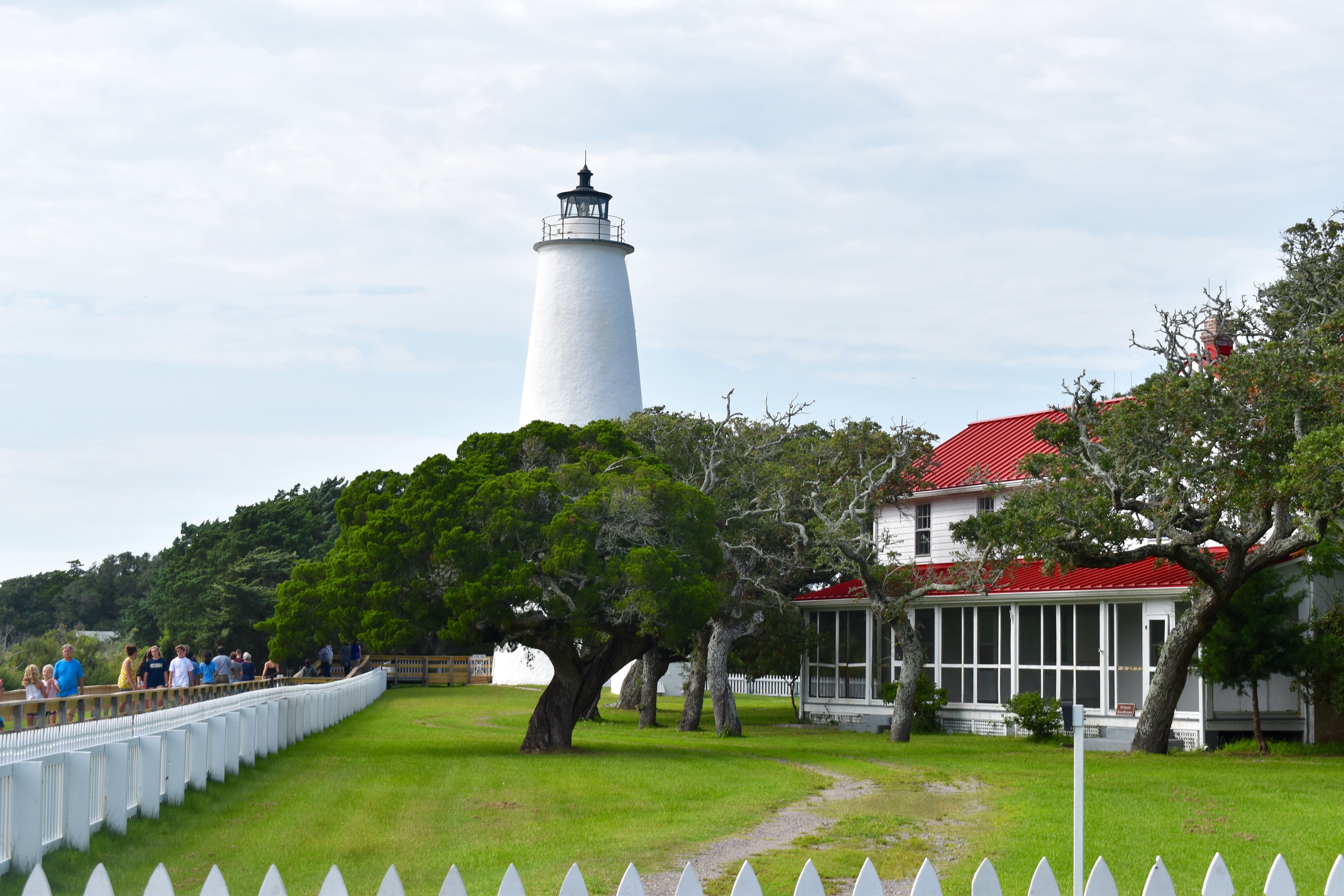 Whether you're driving, walking, biking, using a golf cart or riding the shuttle, you need to stop by the Ocracoke Light House. It's not nearly as tall as the other six lighthouses along the Outer Banks, but for 50 years it guarded the busiest inlet in North Carolina. (At one time ships came in through Ocracoke Inlet for stops at Elizabeth City, New Bern, Edenton and Morehead City. Hurricanes created Oregon Inlet, deepened Hatteras Inlet, filled in Ocracoke Inlet and created additional inlet further south so this was no longer a major passage.) It was built in 1823 and is 75 feet tall. Its diameter is 25 feet at the ground and narrows to 12 feet at the top. The walls are solid brick, five feet thick. A Fresnel lens was installed in 1854. The lighthouse was electrified in 1910. Its beacon can be seen 14 miles out at sea. It is now operated by the U.S. Coast Guard and is the second oldest continuously operating lighhouse in the nation. To get there from the center of the village, take route 12 and when it makes the sharp left turn, begin looking for Lighthouse Road. Turn right (south) on Lighthouse Road and follow it to the lighrhouse. |