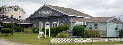 Dajio's hides in such a jungle of Live Oaks, bushes, flowers and vines that you have to pay attention to even find it. Then, you may have to wait an hour for a table. One week, we stopped by five days in a row and never could get a seat. So why put up with all this trouble? The food. The prices are definitely upscale, but this is one of the Outer Banks truly great restaurants. On the Brunch menu, stars are the Seafood Omelette and Baked Dutch Apple Pancakes. For Lunch, the musts are the Cast Iron Maple Glazed Scallops, Clam Chowder (contains leeks, garlic and wild mushrooms, certainly one of the most unique clam chowders you'll taste), the Pamlico Crab Cake and Fried Green Tomatoes. The Wild Mushroom Ravioli, Smoked Duck and Eggplant Napolean are breaks from seafood. But the stars on the evening menu are the Low Country Purloo (chorizo, shrimp, scallops, oysters, clams, rice and veggies), and the Blue Plate Special (fish of the day). In the heart of downtown on Route 12 across from the Post Office. |