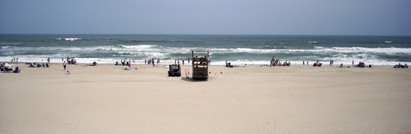 | If you take the car ferry and begin driving down Route 12, you will immediately come to the 13 mile beach (right), rated #2 on the Atlantic Coast. This is Gulfstream water, so it's warm. The waves are big enough to be surfable, but these are not the huge waves of Buxton or Avon, so it's a beach suitable for children. The little Coquinas live along Ocracoke beaches, right at the wave line. The park service maintains rest rooms, changing rooms and lifeguards at each parking area. These beaches are famously uncrowded. | ![]() |