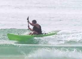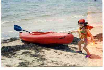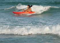 To surfyak, you have to use a kayak. And it's not the same kind of kayak you use back on the Sound. These surfing kayaks are very short, snubnosed, with no keel, but a smooth bottom that allows them to pivot and slide. A touring kayak has to be steady and stable. A surfing kayak has to be lightning quick and buoyant. As a gimmick, some people try a tandem surfyak. It's a cute idea that allows a guy to take his girl out on the water, but it's terrible for surfyaking. They're too long, too heavy and not nearly quick enough. Defenders point out that Hawaiins used them, but they forget Pacific waves are much, much larger. All serious surfyakers paddle solo.The green surfyak top right is a standard sit inside model. The red one shown just above right is a Hawaiin sit on top model. Since no matter how good you are, you're going to be rolled, spun and thrown by the big waves, the sit on top version allows a cleaner exit. It's one thing to just roll or slide off and stand up. It's quite another to be dragged upside down while you try to disentangle your feet and legs. We therefore recommend the Hawaiin style. Surfyaking is possible at Hatteras because the beaches are extremely uncrowded. You can just move up or down the shore 20 yards to where there is nobody in the water. In most places along the East Coast, they ban surfboards and surfyaks because someone might get hurt. We like surfyaking because some of our kids lack the body balance or foot dexterity to master surfing, but they can do pretty well sitting down and have about the same experience. |