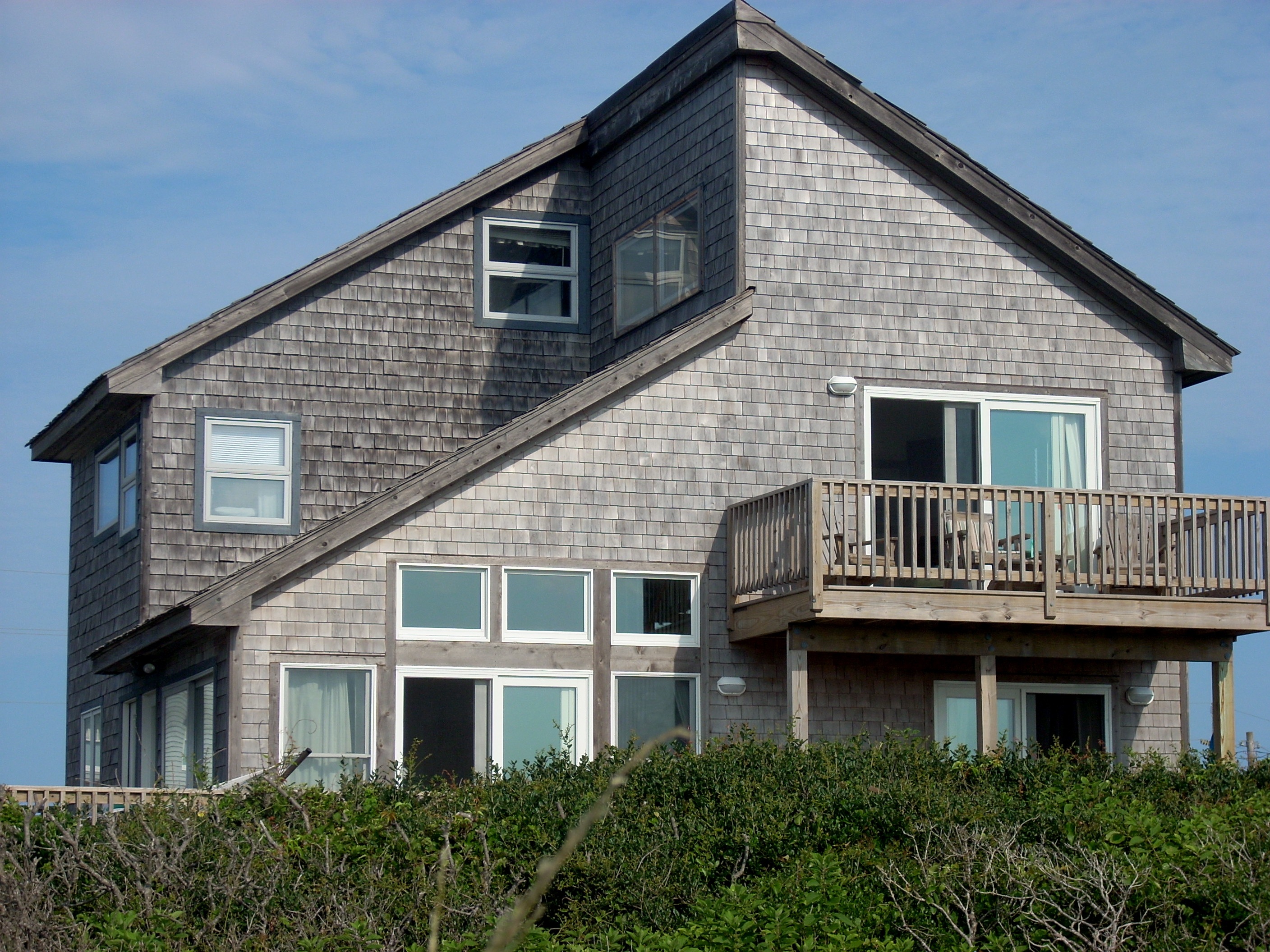 On The Rocks sleeps eight. There's a first floor master bedroom which opens directly onto its own deck. The second floor bedroom contains two bunk beds so sleeps four kids. A third floor bedroom sleeps two more in a queen bed. All rooms allow you to lay in bed and see the ocean, so you can watch the moon rising at night and the sunrise next morning. A private sand trail leads from the house over the dune to the water, but from the decks you can watch the kids playing in the waves. If that's not enough you could sit out on the decks until midnight. Keep the windows open and the sound of surf continually ripples through the house. No matter where you sit in any room, including the kitchen or dining area, you have spectacular views of the water. The beach here is wide, gently sloping, and ideal for kids. The surrounding vegetation is active with a dozen species of birds, plus deer, lizards, crabs, rabbits and raccoon. A flock of Canadian Geese frequents the sand flats just beyond the dead end. The deer graze in the inner dune just below your decks, apparently quite comfortable with humans pointing and taking photos. At $6000 a week, this would be perfect for an extended family or two families vacationing together. |