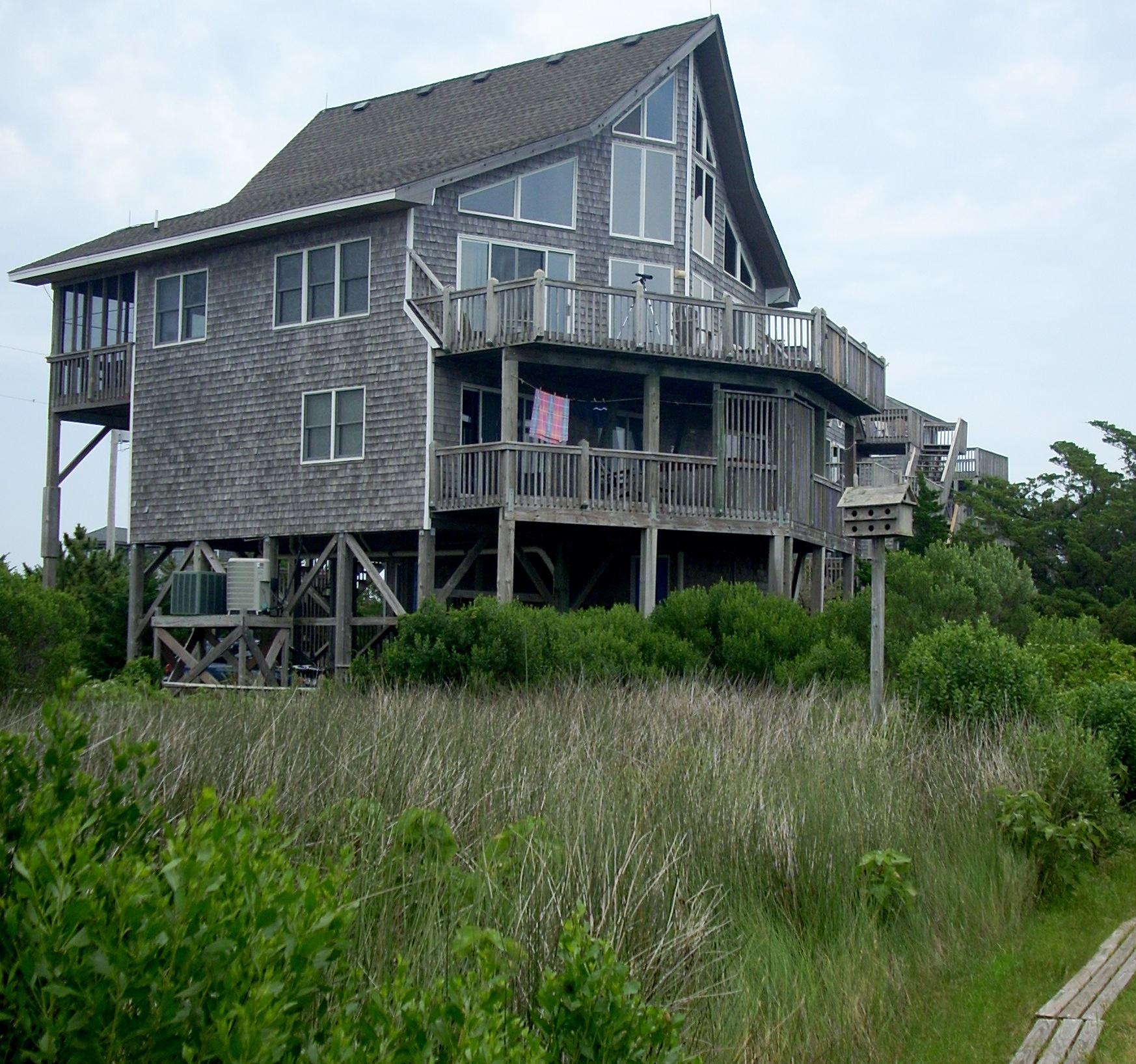 A different kind of bargain is available up in Avon. Just as you enter the community driving north, Park Drive turns left and extends to the Sound. These houses face the national park. For five miles south to Buxton there is nothing but beach, dunes, and low vegetation. You can sit on your deck and enjoy both sunrises over the Ocean and sunsets over the Sound, and the lighthouse five miles away. You can watch windsurfers and kiteboarders on the Sound. And, most spectacularly, you can watch the birds. Bring a powerful pair of binoculars and a camera with tripod and telephoto lens, for this is Birdwatchers' Paradise. We know people who come in the Fall and spend whole days on the deck watching and photographing birds. You walk one block and cross Route 12 to the Ocean beach, or walk part of a block the other way to launch your windsurfing rig or kayak on the Sound (that boardwalk in the lower right of the photo is the route down to the Sound). Or you can bike or drive half a mile up Route 12 to the Canadian Hole launching beach. This house, Shoot the Breeze, is typical of this neighborhood. At Peak Season it rents for $2500, dropping to only $1200 in May or September. It's handled by Vacasa. The house has four bedrooms, three bathrooms and a hot tub. By giving up a waterfront spot on either the Ocean or the Sound, you thus gain a tremendous price and have quick access to both plus incredible views. Other houses on Park Drive are similar. |