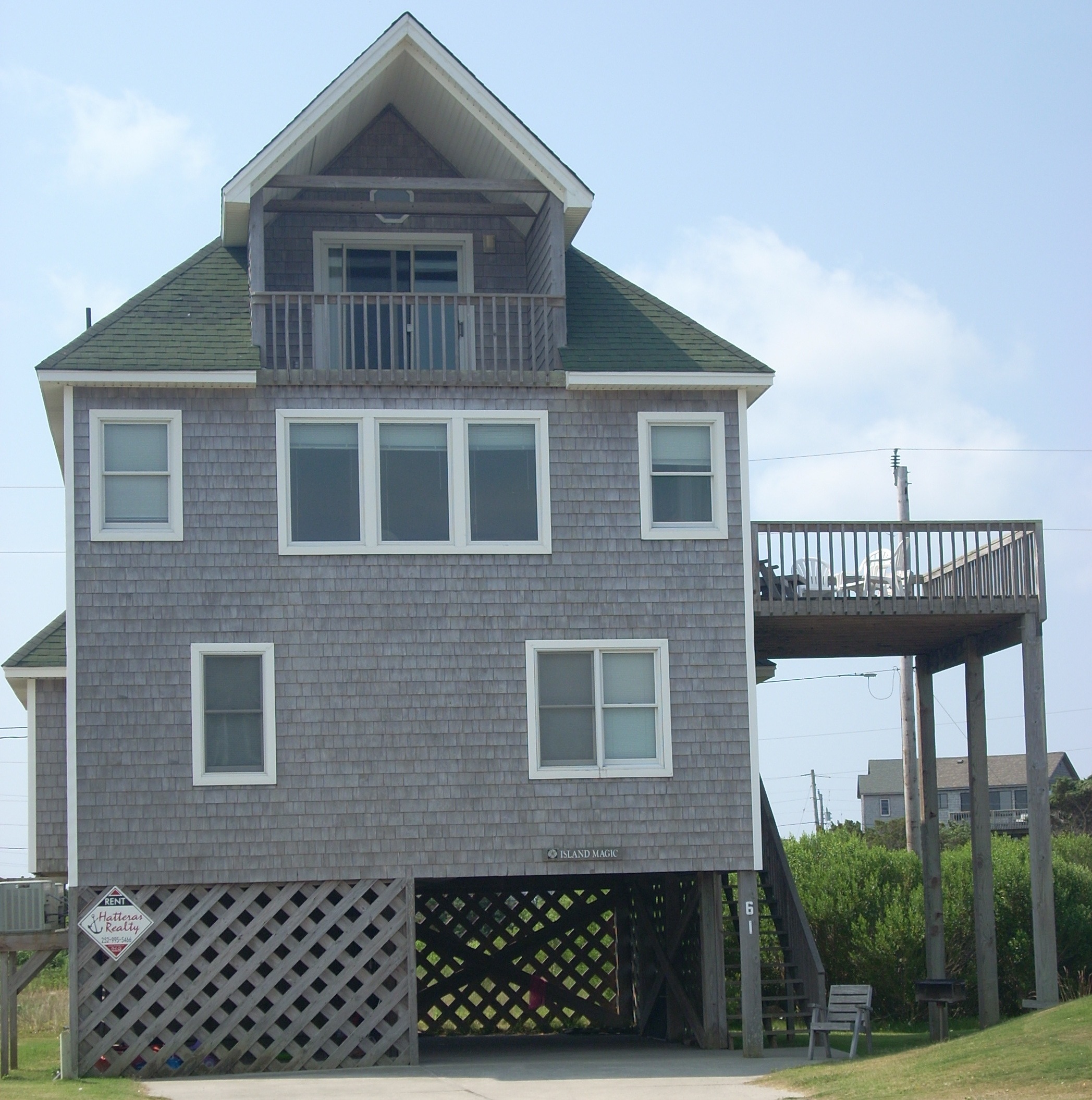 | If you're primarily interested in windsurfing, kayaking, kite boarding, sailing or jet skiing, we strongly suggest this house, Island Magic. It's rented from Vacasa and in our opinion is the best on the island for the sports listed. This house is one yard back from Pamlico Sound. From any of its decks or windows you can enjoy gorgeous sunsets and watch the weather developing, which down here is a spectator sport. This neighhborhood is in North Avon and is directly across the bridge from Ocean Air. They teach their windsurfing lessons right in front of you, and you can rent equipment within steps of your house. Just out of the photo is a great swimming pool and the master bedroom opens out to that third floor roofed deck you see. The water ranges from two to four feet deep all the way to the horizon, so you or the kids can wind surf, kayak, kite board or float in inner tubes with no worries. The front beaches on the ocean are only a block away across Route 12, so you get the best of both. Several good restaurants are within walking distance or a very short drive. There's even a neighborhood Dairy Queen a short walk down Route 12. Island Magic is ideal for a family of no more than six. This is known as the Island Creek Community. | ![]() |