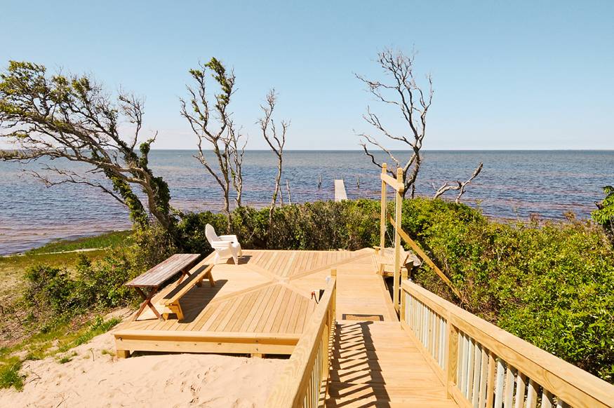 If you're not particularly into swimming in the ocean or surfing, but are into windsurfing, kayaking, fishing, birds, sunsets, weather fronts and astronomy, the best deal on the island may be Pax, a Midgett Realty property on the Soundfront. Pax is hidden in the trees with a driveway off Route 12. This is a beautiful small house with plenty of windows capturing sunlight from the Sound. It holds six people and you can bring your pet. In the center photo below you can see the dock extending out over the water, where you can tie your canoe or kayak. Pax even comes equipped with its own canoe and kayak so you don't have to cartop your own. On arrival, just carry the canoe or kayak to the water and keep it tied there, ready for your daily fishing or paddling cruise. Hidden by the bushes in the photo is a staging beach where you can lay out your windsurfing or kiteboarding rig. The screened porch catches the constsnt breeze off the Sound, the same breeze windsurfers and kiteboarders love. With its West sky view, you can bring your telescope and enjoy the best planet and stargazing ever. |