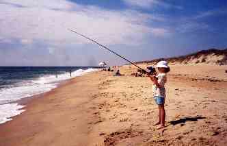 There are certain skills involved. If no one in your family or group has those skills, we'd recommend you stop by The Red Drum and hire a guide. Even if you only hired one for the first morning or evening, you would then know what you were doing the rest of the week. If you don't want to do this, try buying or checking out a book on surf fishing back home and reading up on it before you come. You can practice casting in your backyard using a freshwater reel and several old tires. If you're new to surf fishing, casting will be your biggest challenge. You'll need several days practice to get good at it. Many fishers go down to the beach in the mornings and practice casting, then go back in the evenings to actually fish. |