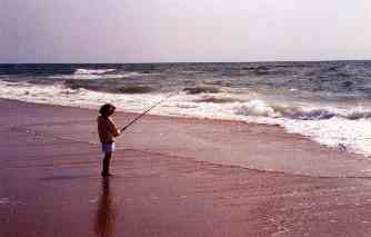 You'll be fishing mostly for Sea Bass, Striped Bass, Flounder, Red Drum and Blue, although you may catch Spanish Mackeral and Sea Trout. You may even catch a Shark or Manta Ray. Most veteran surf fishers fish with the tide. You can pick up a tide chart at the Red Drum. Ideal fishing is usually the hour before and after high tide. Tide charts indicate the tides at Buxton Beach. If you're fishing at Frisco or any other place, you have to add or subtract minutes. The guys at the Red Drum can advise you on this. |