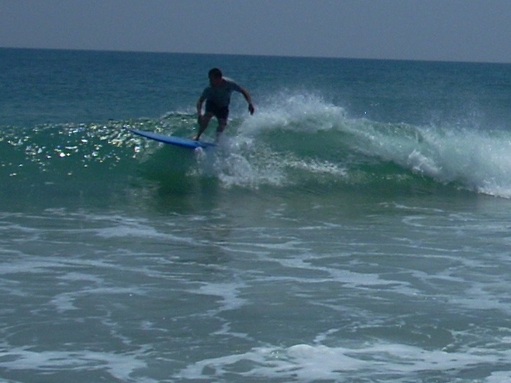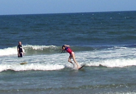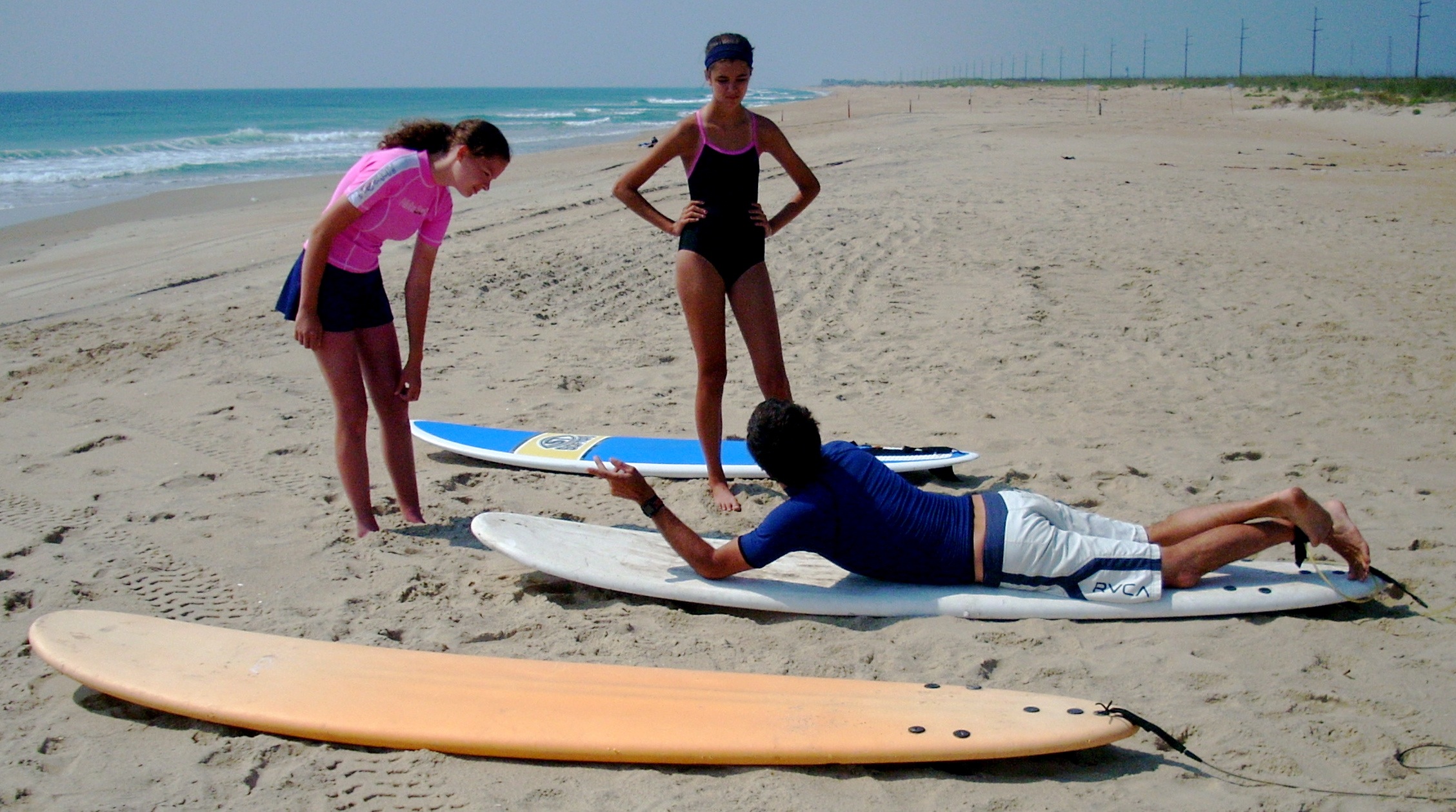 There are several places at Hatteras where you can start from scratch and learn to surf. They can rent you the equipment, teach you the basics and bring you through several days of instruction until you're surprisingly good by the time you go home. They offer kid, beginner, group and family rates.We suggest the Avon Surf Shop, shown at left. We have had some very good surfing instructors here over the years and they are good with kids individually and in groups. Scheduling is somewhat tentative. They wait for good breaking waves and the right tidal point. As Chris conducts this class, he talks about how to get the board out beyond the surf line, then discusses proper riding technique and standing up on the board. During the first hour, students learn to catch and ride waves in while laying down. During the second hour they get up to a kneeling position, then work on standing. A typical lesson lasts two hours, although some students cannot last the full time. They lack the upper body strength or stamina to stay out on the water. Chris recommends anyone coming to Hatteras on vacation swim laps in a local pool every day for six weeks back home to build arm strength and stamina.