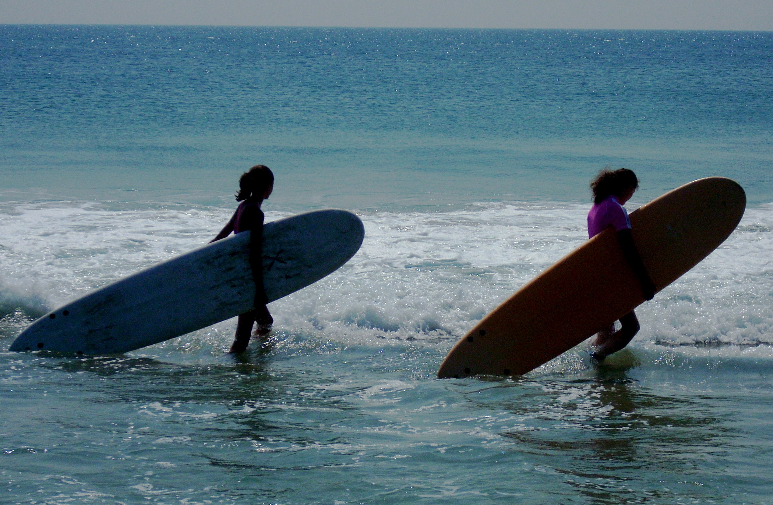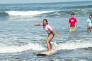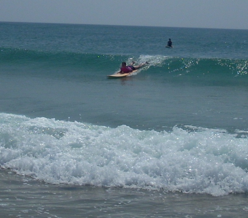 These two photos are at Lighthouse Beach. The girls are both in grade school, proving that even young kids who don't live near the beach can learn to surf quickly under good instruction and with the proper equipment. Both of these shots show waves breaking over the bar at low tide. Most students can learn to mount and stay on the board, catch a wave and ride it to shore in the first lesson. However, it usually takes a second or third lesson before the student can successfully stand on the board and remain upright all the way to shore. | ![]() |