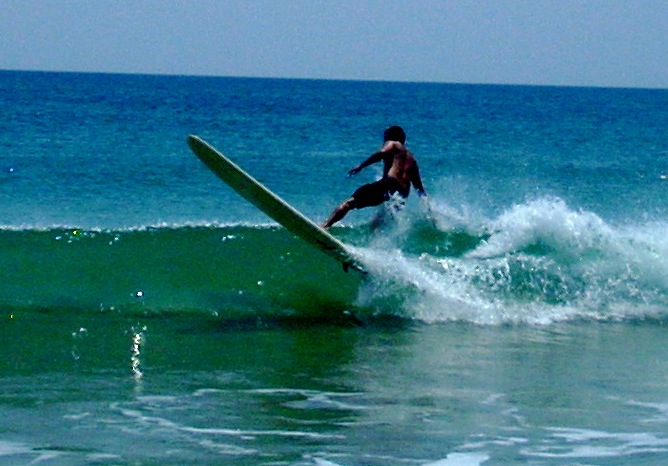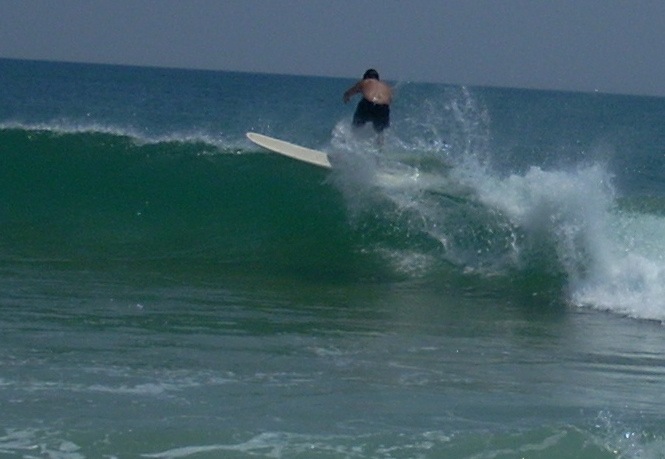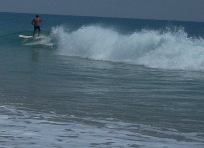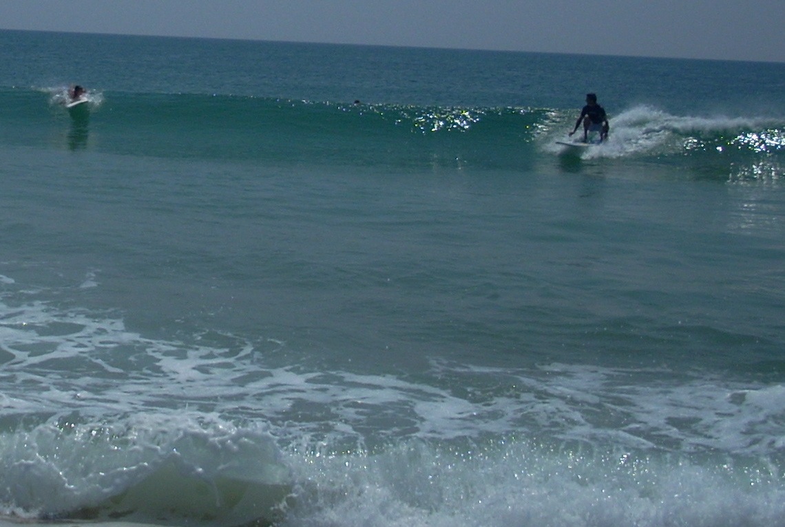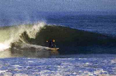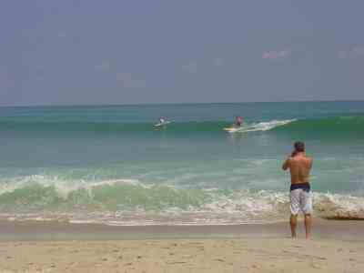The North Beach refers to the long stretch from Rodanthe to Oregon Inlet. It gets the second best waves on the island, and does not have the jetties to worry about. For parking, everyone just pulls off onto the sand, but the sand here is loose , so just about every day a tow truck is pulling someone back onto the pavement. You have a huge dune line to haul over. Currents can be tricky here because the current coming out and the tidal flow coming in and out of Oregon Inlet twice a day sets up eddies which curl South and interact with the waves coming straight in. It doesn't make it dangerous, but you find yourself continually misjudging break lines. The North Beach doesn't have the trough and bar profile. It's definitely worth one day, but we don't think the North Beach beats The Iron Jetty. |