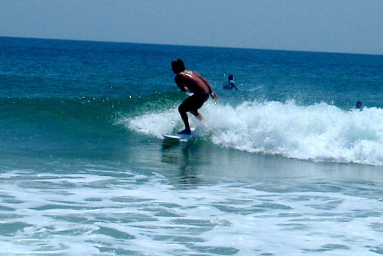 | Iron Jetty Beach is known to surfers as The Wave Magnet. It sits between Buxton and Lighthouse Beach, where the beach zigzags 50 yards. That zigzag is due to the jetties, built in 1967 to protect the Navy Base and lighthouse. They caught the sand moving southward and built out the shoreline. Today, the base is closed, the lighthouse moved, and the jetties deteriorated. But this point still attracts the biggest waves on the Atlantic Coast. For 50 years this has been a surfing hangout. This is where locals come after work, and vans with faraway license plates bring deeply tanned surf bums with multiple boards and wetsuits. The Eastern Nationals have been held here often, and photos from here frequent surfing magazines. This is not a swimming beach. The jetties make that dangerous. It is not a place for new surfers unless accompanied by a qualified instructor. But if you have experienced surfers, this is where to bring them. They can try the big waves, and learn by watching and talking to the best this side of the Banzai Pipeline. A large parking lot is only a few steps from the sand. In this photo, you can make out the surfers just left of the jetty. | ![]() |
