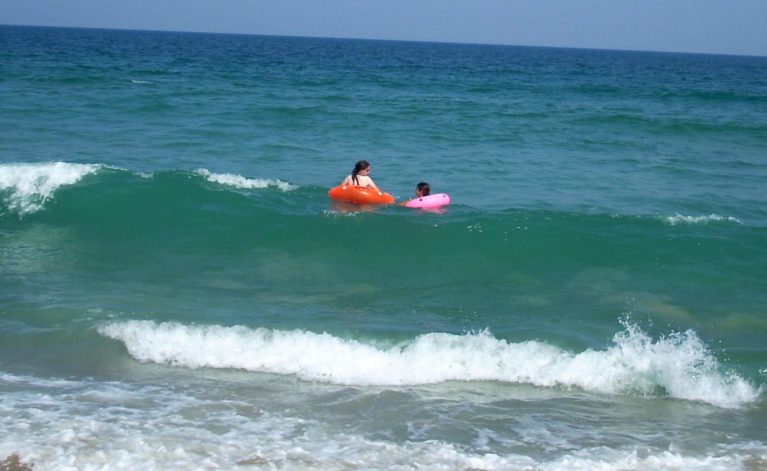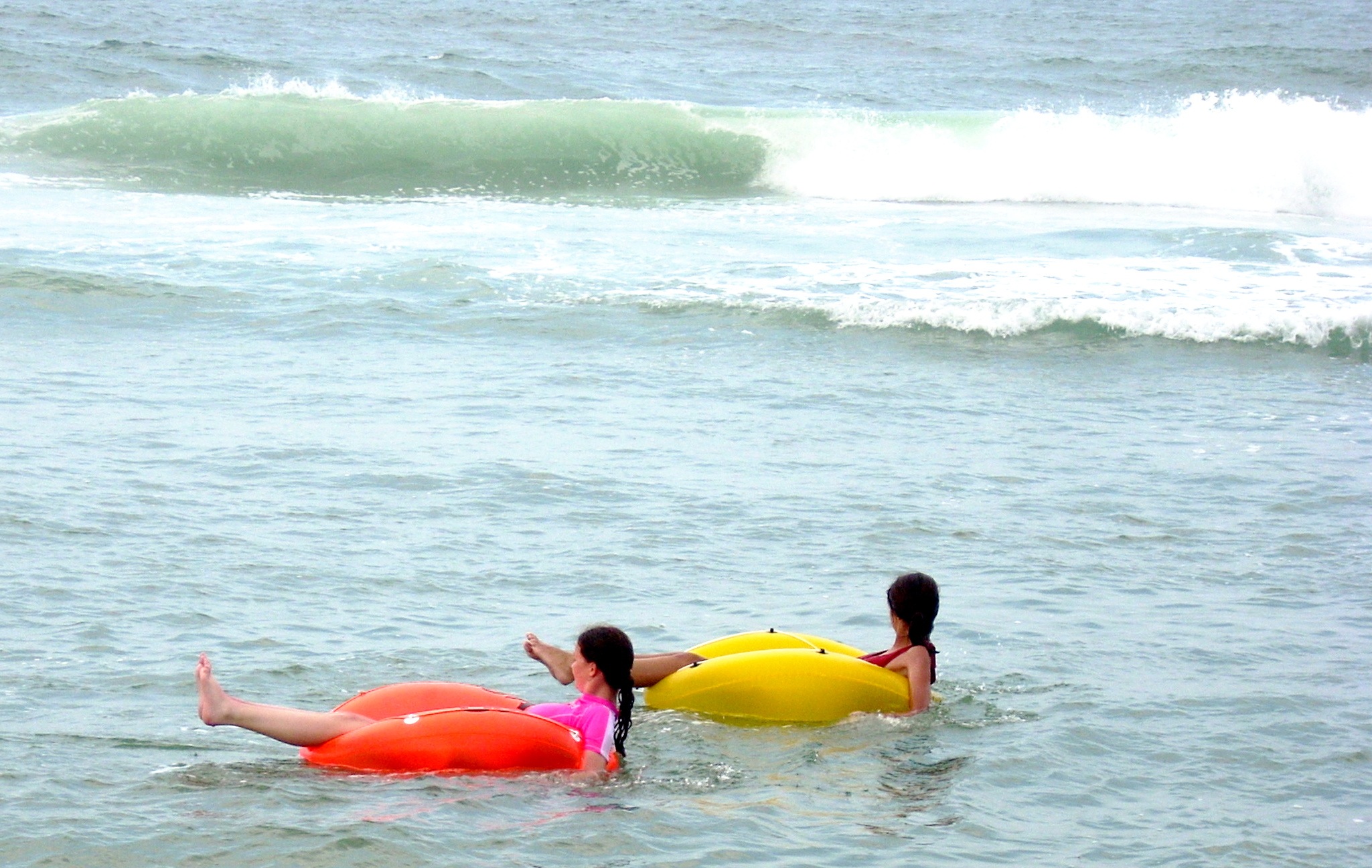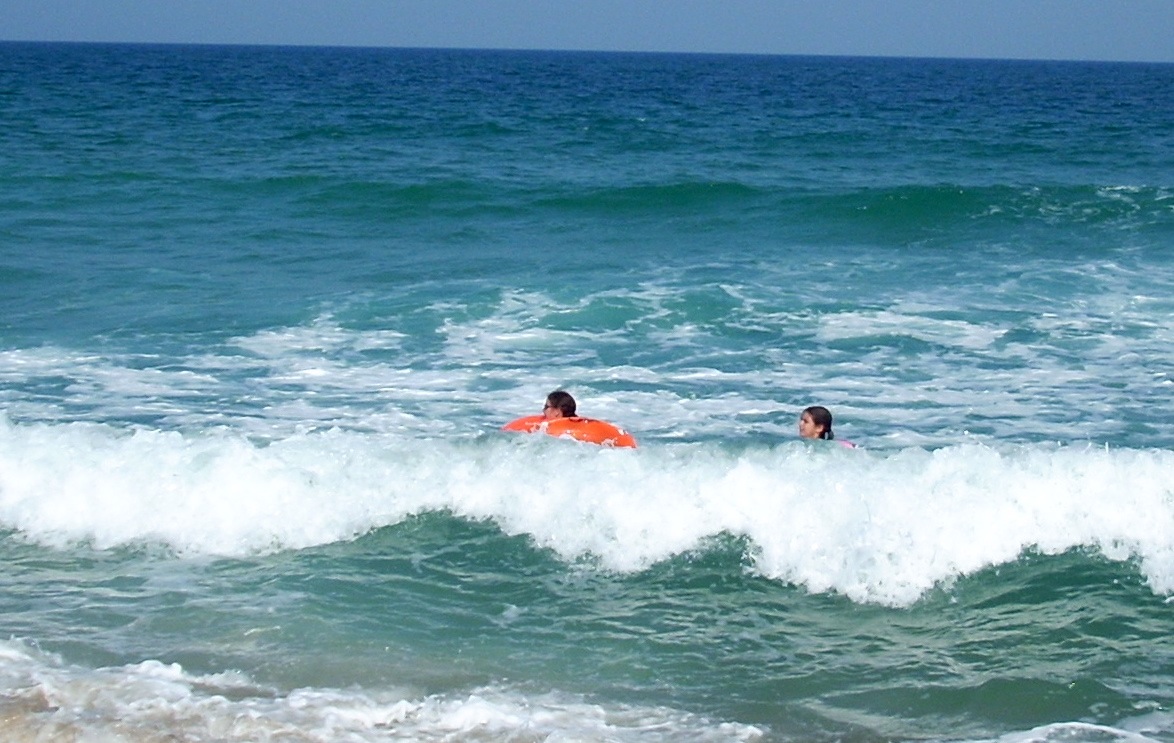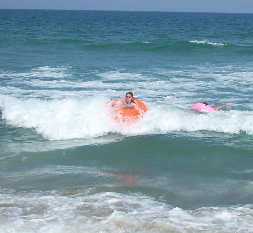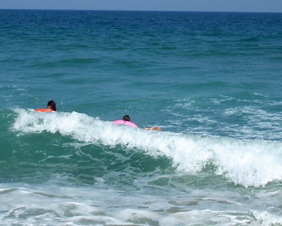 At right the girl at left is using the small pink tube, which allows her to ride in deep water with body below the surface. She can thus use her feet and legs to frog kick, turning the tube quickly or pushing it straight ahead. Having her feet and hands both available allows her to deal with the bigger waves out beyond the bar. Notice the girls are barely beyond the break line. They are not interested in paddling out toward the open ocean. They have just cleared the wave at the bottom of the photo and are positioning themselves for the large wave visible in the opper fourth of the photo. It will begin to break as it approaches the bar, and they have time to turn and kick vigorously to bring their forward speed up to that of the wave. They must match the wave's speed to catch it. If they do that, they can ride it all the way to shore. |