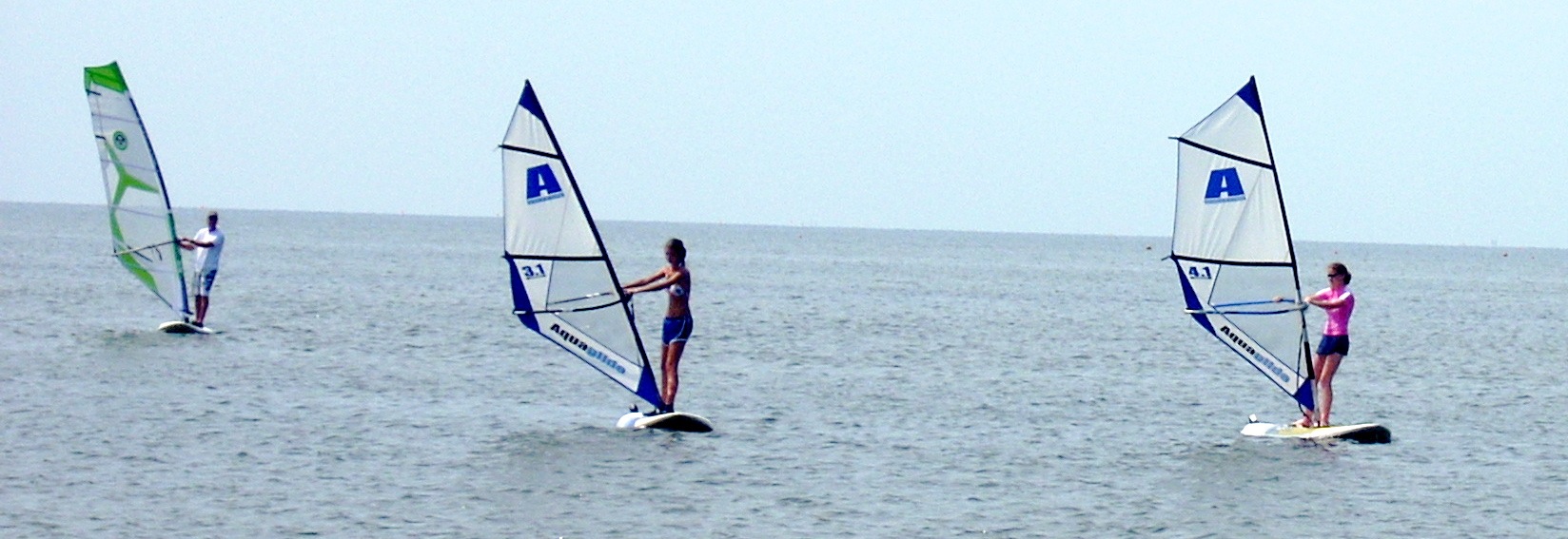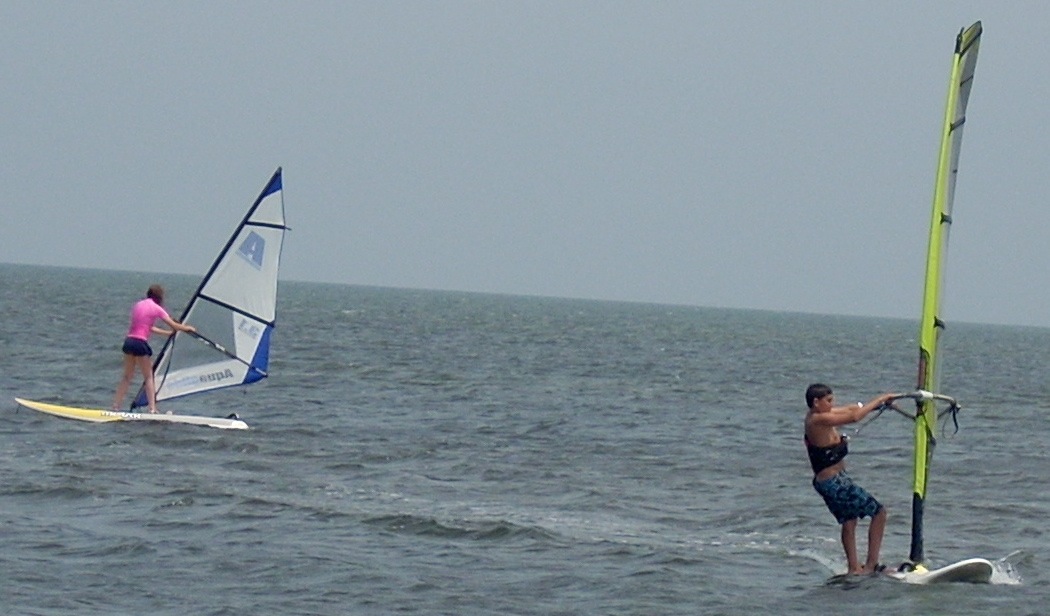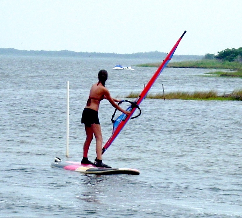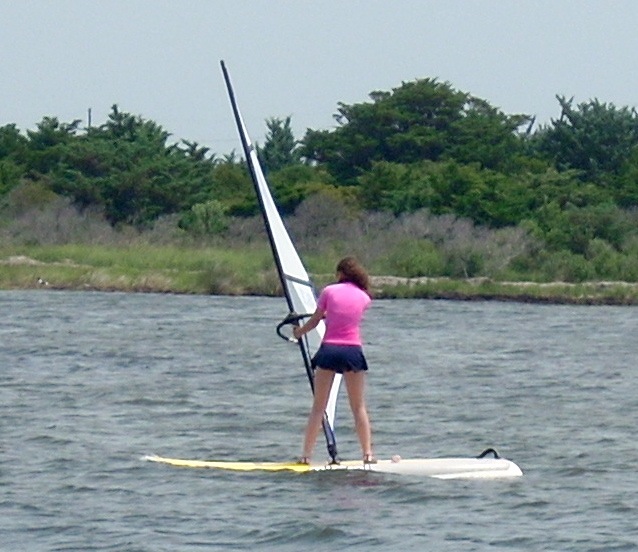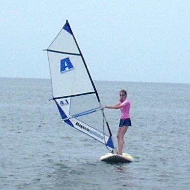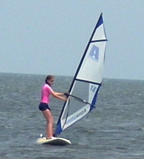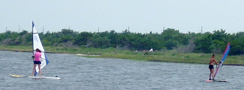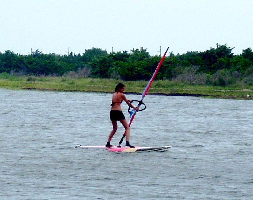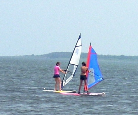 Windsurfing is not a sport of brute strength. It is a sport of body balance and coordination. Girls are often much better, especially early, than boys. Part of this is due to their body builds. Males have their weight concentrated above the waist. Girls have theirs concentrated between the waist and knees. This allows girls to more easily balance on the boards. It is always entertaining to watch 100 pound teenage girls outdo their football playing brothers or boyfriends. Adults can sit on the broad lawn and watch the lessons. With a compact camera equipped with a good telephoto lens you can take all the photos you want.