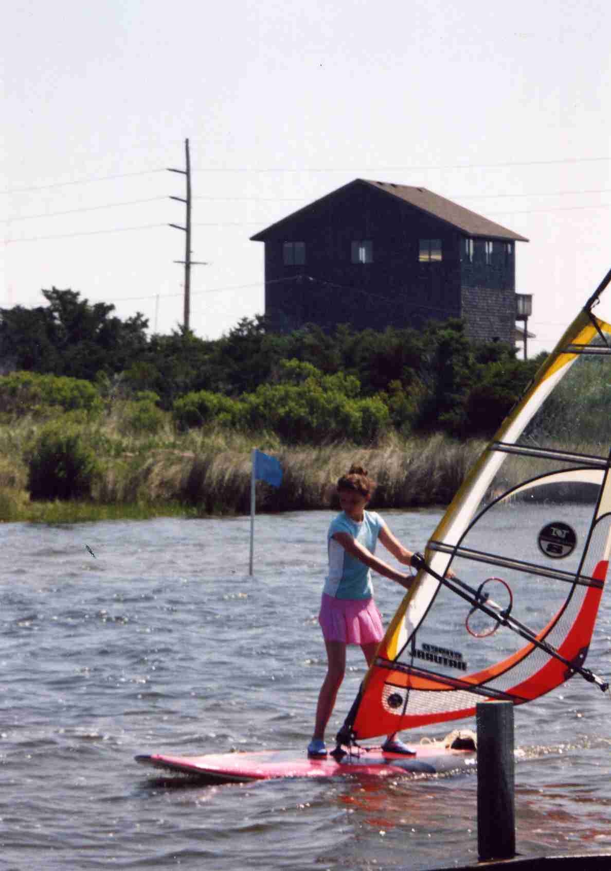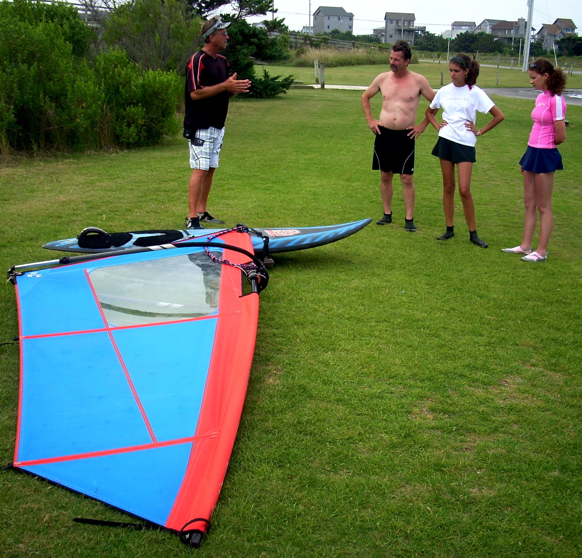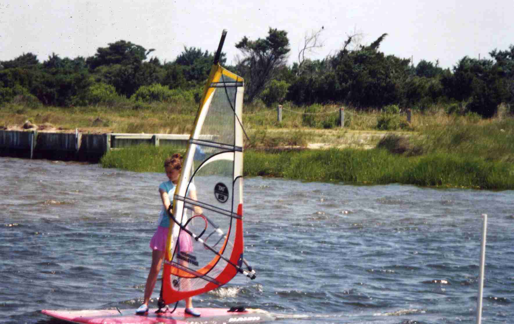 Windsurfing is not a sport of brute strength. It is a sport of body balance and coordination. Girls are often much better, especially early, than boys. Part of this is due to their body builds. Males have their weight concentrated above the waist. Girls have theirs concentrated between the waist and knees. This allows girls to more easily balance on the boards. It is always entertaining to watch 100 pound teenage girls outdo their football playing brothers or boyfriends. Adults can sit on the broad lawn and watch the lessons. With a compact camera equipped with a good telephoto lens you can take all the photos you want.