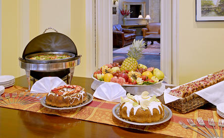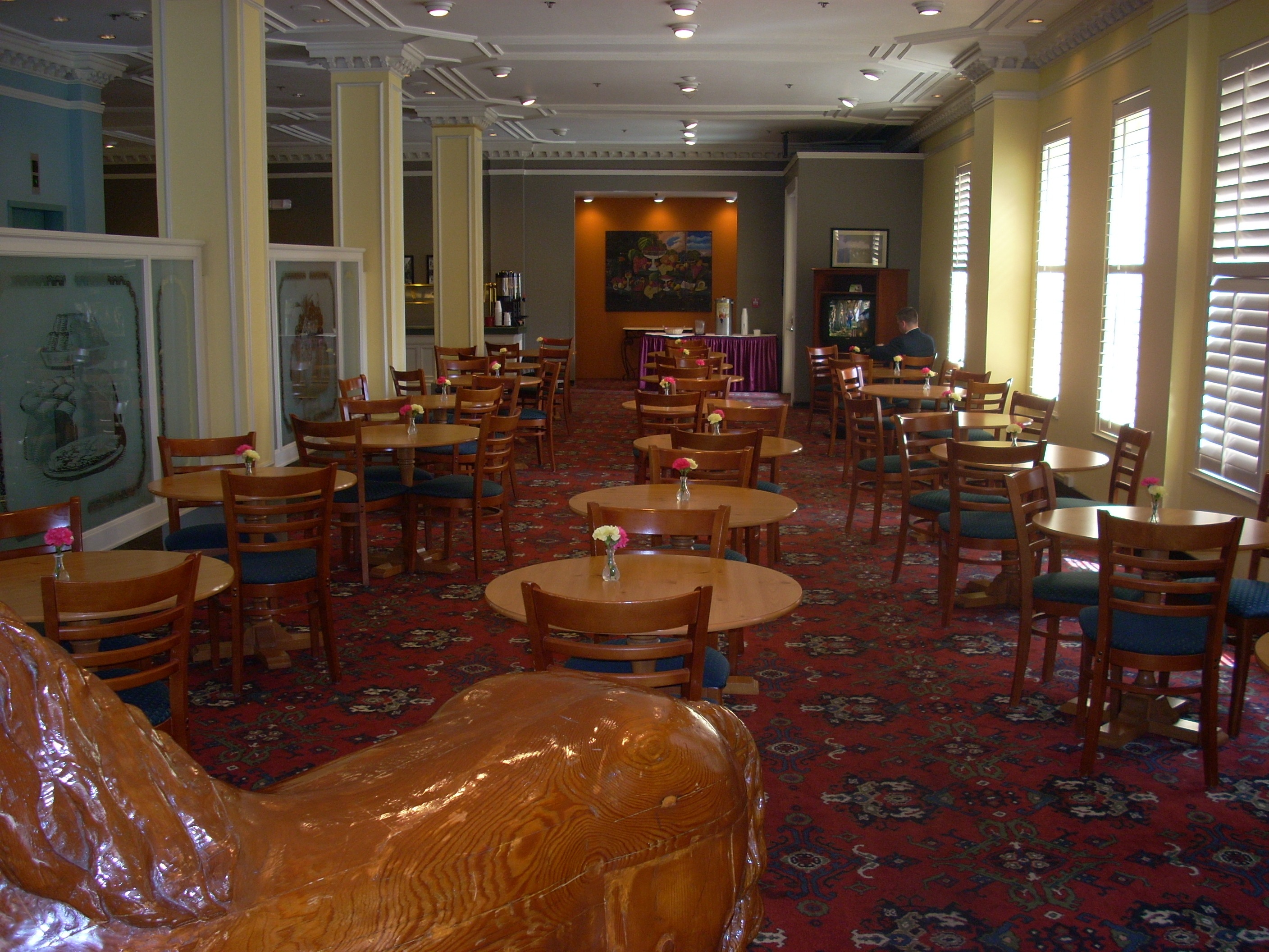 We've stayed in hotels and bed and breakfasts all over the country and The Crockett offers the finest complimentary breakfast in the 21st Century. This is the kind of continental breakfast everyone USED TO provide, but one by one even the great New England bed and breakfasts have cut way back. Not the Crockett. You get several kinds of juices, coffee, and tea; a magnificent array of fruits, strawberries, blue berries, and whatever else is in season; breads, bagels, toast, Danish and pastries; Texas shaped waffles; various flavors of yogurt; cereal; and on a rotating basis French Toast, pancakes, eggs, frittatas and other items. On top of all this the hotel provides compliementary copies of the San Antonio daily and USA Today for you to peruse while eating breakfast. The setting for this morning feast is shown below right, a classy restaurant just off the lobby, with windows looking out on the Alamo (under the green awnings at far left in the photo above). |