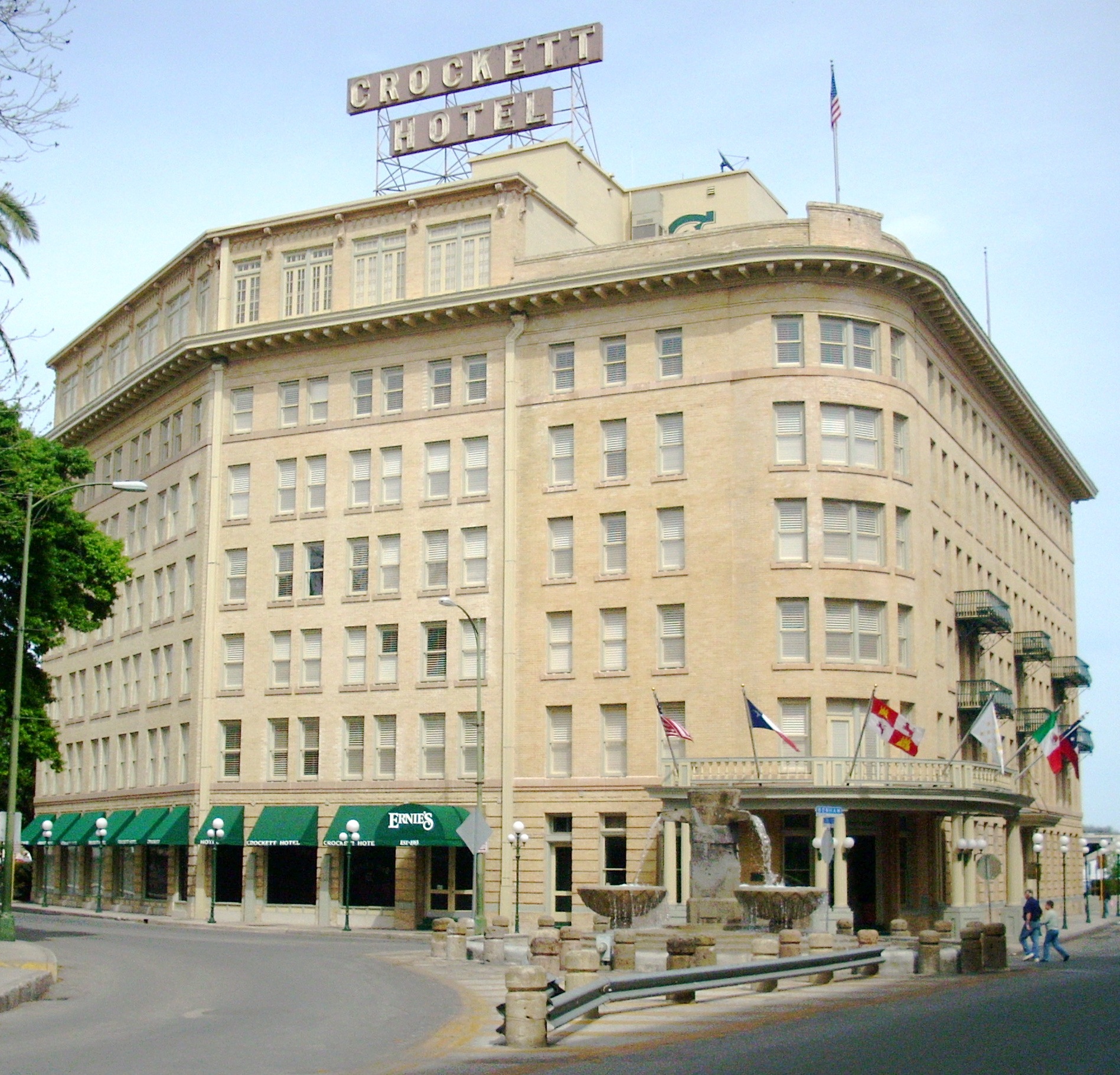 | Downtown San Antonio is a very special place, and to fully experience it you need to stay downtown. Trying to save a few dollars by staying out on the city's edge and driving back and forth defeats the purpose of your visit. Besides the aggravation of getting back and forth, the parking cost will nullify any savings you think you're gaining. And once you decide to stay downtown, our lodging recommendation centers on a single hotel. You really need to stay at the historic Crockett. The windows you see in this picture at right look right out on the Alamo. The stairs start down to the Riverwalk just at the edge of Alamo Plaza. Right across the street from the Crockett, to the right in this picture, is RiverMall, the largest glass enclosed structure in the world. The Crockett is one block from Commerce Street, the main street of San Antonio. So the location cannot be beat. But you also need to stay here for the historic value of the hotel. This has always been THE hotel of San Antonio. Presidents, kings, queens, athletes, movie stars, executives, and other celebrities have made this their headquarters for over a century. Small by modern standards, the Crockett has only six floors, 138 guest rooms and a modest lobby. But a renovation back in mid 20th Century and another one in 2007 have kept it on the cutting edge. You have key card security, wireless internet, and the usual package of refrigerators, hair dryers, irons, in room movies, etc. You have secured parking and full concierge service. Suites are available for families or groups (those are the rounded window sets on the corner of the building). The only caution is that you have to make reservations ahead. The Crockett remains a popular hotel. Individuals, families and groups have been returning to it every year for decades. Conventions are housed here almost every week (those larger windows up on the seventh floor are executive meeting rooms). So book early. But it's worth it. | ![]() |