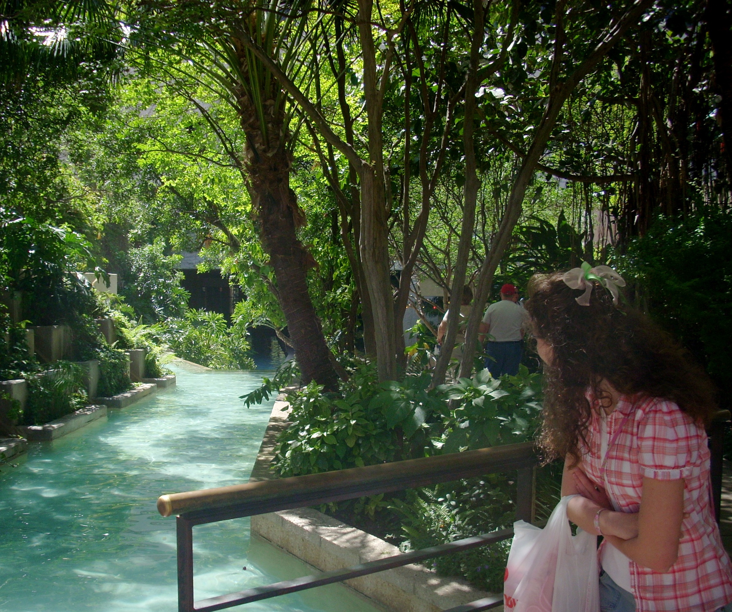 The third hotel on Alamo Plaza is the ultramodern Riverwalk Hyatt. You walk through its 16 story atrium to get down to the Riverwalk from either the Crockett or Menger. This is a typical 21st Century palatial hotel, with rooftop pool and hot tub, top 10 restaurant, spa, shops, interior waterfall, full gym, and all the other amenities. Incredibly, its rates for basic family doubles or basic king bed singles are the same as the Crockett and Menger, if you make reservations far enough ahead and belong to either AAA or AARP or qualify for any of the other traditional discounts. You obviously don't have any of the history here, but you can get a room looking down on either Alamo Plaza or the Riverwalk. The Hyatt also offers an impressive complimentary breakfast and it almost seems they're in a competition with the Crockett, because they're both memorable. The Hyatt has three times as many rooms as the Crockett or Menger so it's easier to get a reservation, but we still recommend calling well ahead. The Hyatt features an outdoor - indoor subtropical rainforest along the walkway through its atrium (left). |