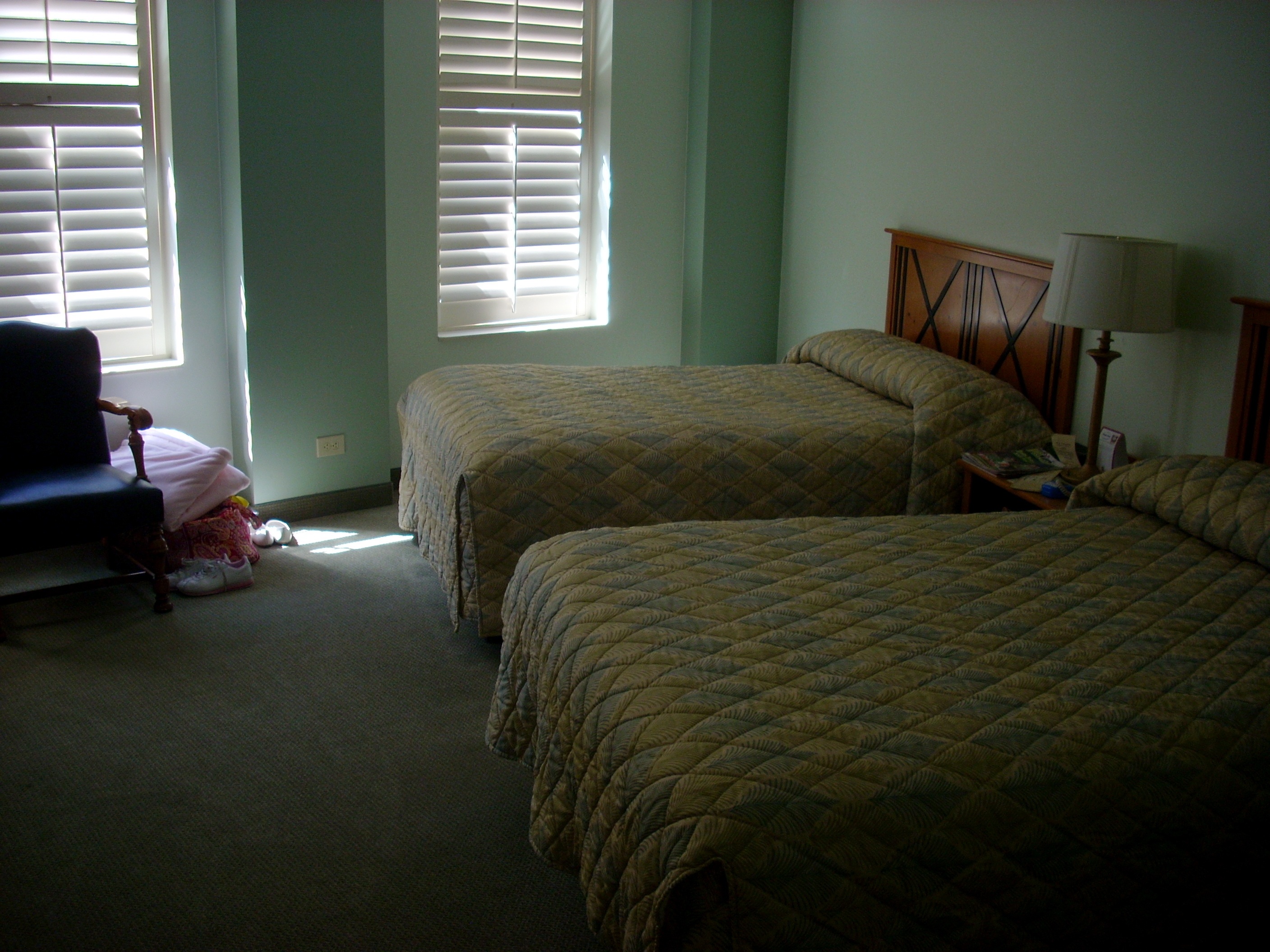 Crockett rooms are quietly plush. Some have king beds, some two doubles, and some are suites. This particular double is one of our favorites, slightly larger than the others, because it occurs on each floor at the angle you can see in the photo above where the hotel conforms to the bend in the street. This gives the room an angled shape. Three windows look out on the Alamo and have heavy wooden shutters you can tilt to admit varying degrees of sun, or you can swing the shutters totally open. The tv is quite large. The bathrooms, even though remodelled in 2007, retain their 1950s flavor, but are quite spacious, with high showerheads. The numbers on these rooms are ---06 (206, 306, 406, etc.). If you want to look out beyond the Alamo to see the whole plaza, you need one of the top two floors : 506 and 606. These are nonsmoking rooms. There's a work table big enough for a full sized laptop computer and the folders or papers you would normally need. The ultramodern hotels down on the Riverwalk charge twice as much for their rooms, but they're neither bigger nor better than these. |