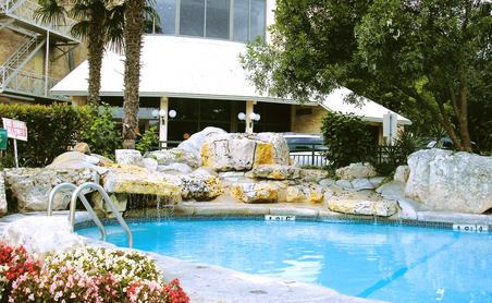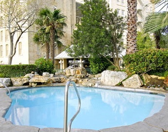 | The Crockett's pool is outdoors, meticulously landscaped with rocks, trees, flowers and other greenery. The climate here is usually warm and humid, so the pool is a popular stop after a day exploring downtown San Antonio. After the Alamo closes each evening, the plaza quiets down, and while floating lazily in the pool the only sound is the clippetyclopping of horsedrawn carriages passing by. | ![]() |