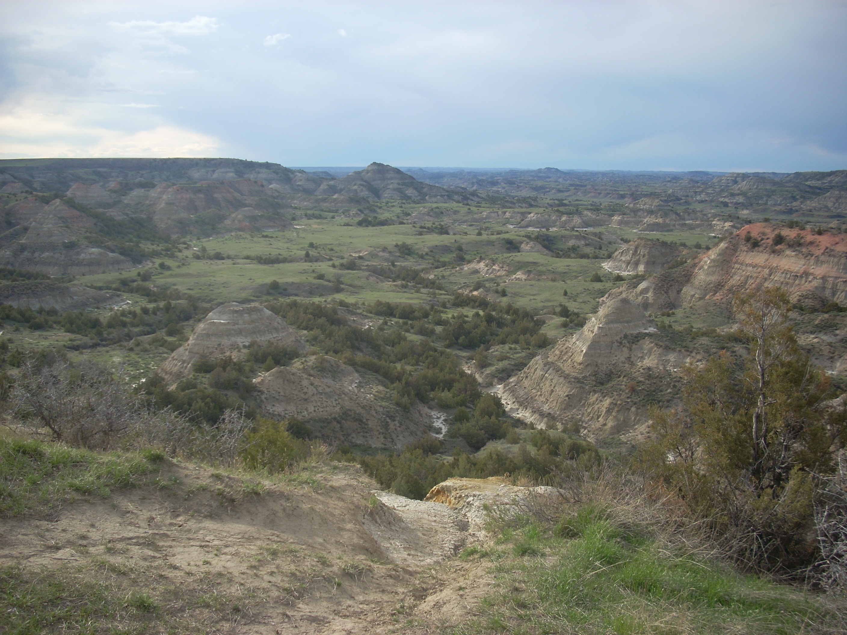 From the Dells you take I-90 and I-94 northwest. Where I-90 swings left (West) to head for South Dakota and the Black Hills, you stay on I-94, which you'll take on through Minneapolis (top left), Fargo and Bismark en route to Theodore Roosevelt National Park. This second day is a long haul, 773 miles. With a few gas and snack stops it takes about 12 hours. Remember you cross another time line. If you make this trip in late Summer, you'll see why some natives call North Dakota "The Sunflower State" (see top right). You should be arriving at Medora just in time for a sneak preview of the park. The interstate runs right along its Southern edge, and the Painted Canyon Visitor Center has its own exit to your right. Stop here. It should be evening and the setting sun should lend lots of color to the landscape. You may want to walk over to the railing and take a few photos. Then, driving on, keep your eyes open for wild horses, buffalo and antelope. Continue on past Medora to Exit 18. Drive past the campground. You'll climb the hill, swing to the right, and drop down the other side. The Buffalo Gap Ranch central holdings are 1.3 miles on the unpaved road. |