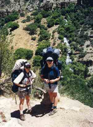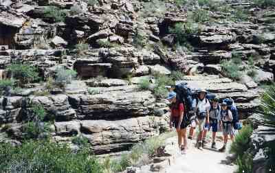 About once an hour, a pack train heading up or down passes you. The rule is that they have the right of way. You are to step above the trail and remain motionless as they pass. In many places this is easy, but if you meet one where the trail narrows against the cliff it becomes pretty dicey. You lean back into the cliff, but of course your pack prevents you from getting totally out of the way. The animals seem to be dangerously close to the edge. Fortunately, they've been carefully trained, most of them have been doing it a long time, and they're extremely sure footed, so they manage to skirt the edge without incident. There are only a few places where the wrangler will hold the train until hikers clear the section. Back in Kentucky, the present fad is the internal frame backpack. Sometimes we go whole weekends and never see anyone with an external frame pack except us. And some of us have even used internals out West in places like the Wind Rivers, Yellowstone and Glacier. But not in The Canyon. We didn't see anyone with an internal frame. They would be too hot. The external frame allows air to circulate between the back and the pack. Kelty Tiogas and Super Tiogas for guys and Gregory Evolutions for girls seem to be the overwhelming favorite of canyoneers. |